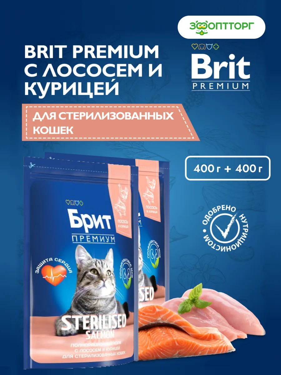 КомплектацияBrit Premium Cat Sterilised для стерилизованных кошек и кастрированных котов Лосось, 400 г - 2 шт.