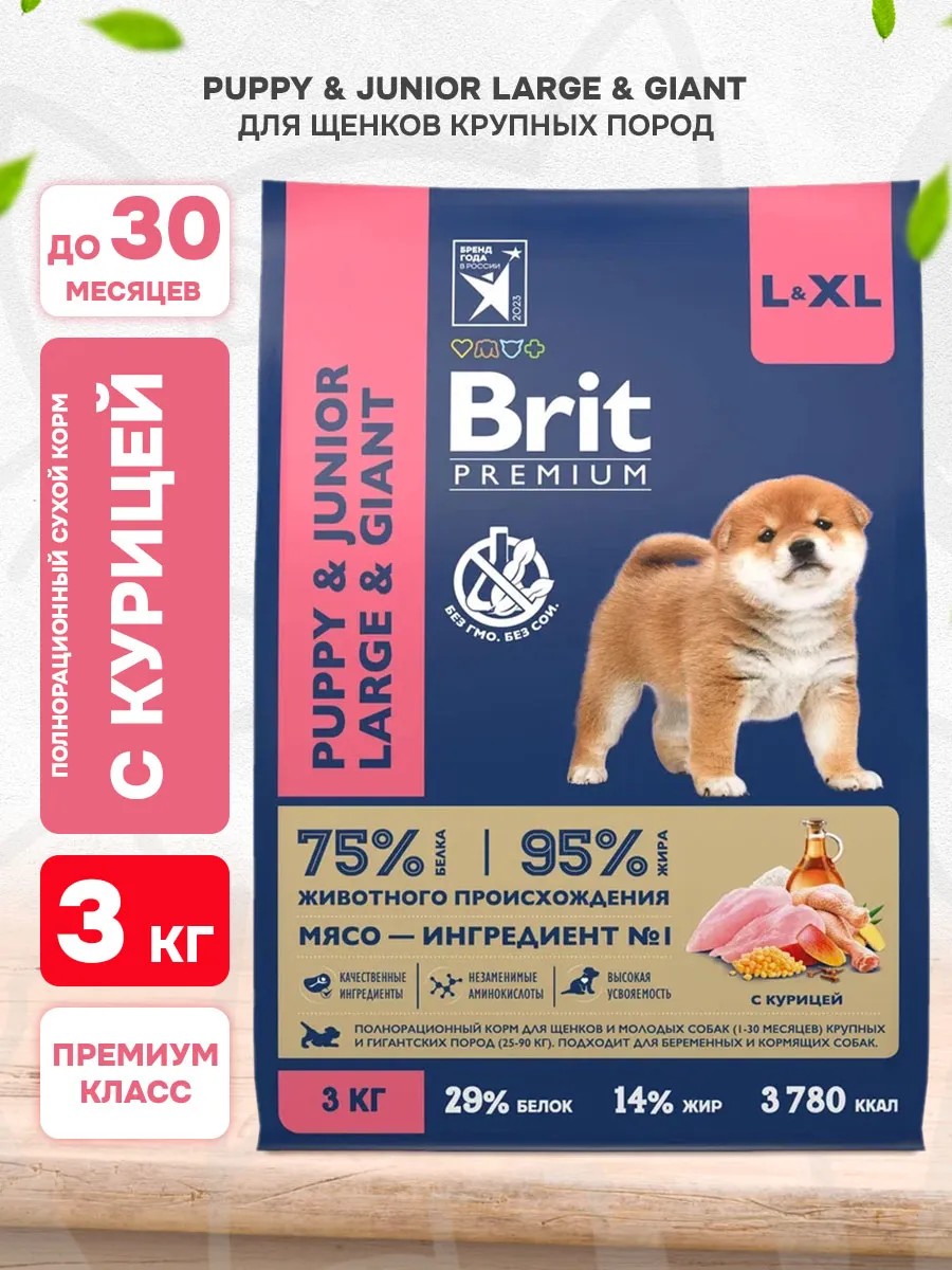 Полнорационный сухой корм Brit Premium Puppy and Junior Large and Giant с курицей для щенков (1-30 месяцев) крупных и гигантских пород (25-90 кг).