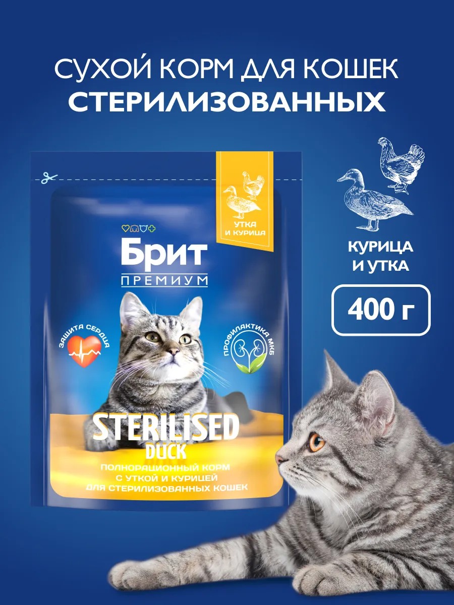 Полнорационный сухой корм премиум-класса с уткой и курицей для взрослых стерилизованных кошек, 0,4 кг. Сбалансированный состав содержит все витамины и минералы, необходимые для ежедневного здорового питания вашего питомца. Корм поможет сохранить здоровье и активность вашего питомца, а мясо в составе обеспечивает притягательный аромат и вкус, который не оставит равнодушным даже самых привередливых питомцев. Корм следует давать сухим или увлажненным теплой водой. У животного всегда должен быть доступ к миске со свежей водой. Важно: При вводе нового корма смешайте его небольшое количество с привычной едой и в течение нескольких дней постепенно увеличивайте количество нового корма. Следуйте рекомендациям по ежедневному питанию, представленным в таблице.