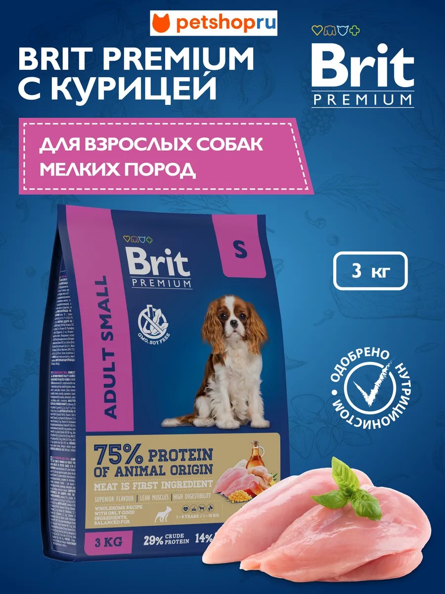 Complete dry food bBrit Premium Dog Adult Smal/b with chicken for adult dogs of small breeds (1-10 kg).br/bBrit Premium/b is a premium food with a high meat content of 30%, including 14% chicken. The composition is perfectly balanced and meets all the needs depending on age and breed. The content of essential amino acids contributes to healthy harmonious development.A balance of vitamins and minerals for strong immunity, as well as prebiotics for healthy digestion. The use of cereals with different glycemic indexes creates a feeling of satiety, reduces the glycemic index of the cereal component. The tempting aroma and excellent taste are provided due to fresh natural ingredients.Does not contain artificial additives, colors, flavors. Important: When introducing a new food, mix a small amount with your pet's regular food and gradually increase the amount of the new food over several days. Follow the daily feeding recommendations provided in the chart. Feeding amounts may vary depending on factors such as age and activity level.