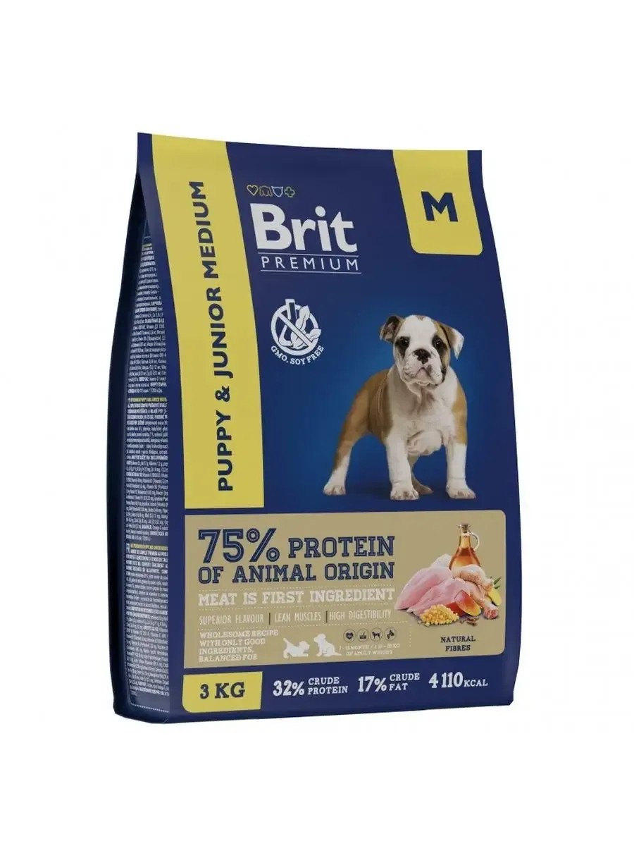 Brit Premium – корм премиум класса с высоким содержанием мяса 30%, в том числе мясо курицы 16%. Состав идеально сбалансирован и отвечает всем потребностям в зависимости от возраста и породы. Содержание незаменимых аминокислот способствуют здоровому гармоничному развитию. Баланс витаминов и минералов для крепкого иммунитета, а также пребиотики для здорового пищеварения. Использование злаков с различным гликемическим индексом – создает чувство насыщения, снижает гликемический индекс злаковой составляющей. Соблазнительный аромат и прекрасный вкус обеспечивается за счет свежих натуральных ингредиентов. Не содержит искусственных добавок, красителей, ароматизаторов. Энергетическая ценность на 1 кг: 4110 ккал. Рекомендации по кормлению: Корм следует давать сухим или увлажненным теплой водой. У животного всегда должен быть доступ к миске со свежей водой. Важно: При вводе нового корма смешайте его небольшое количество с привычной едой и в течение нескольких дней постепенно увеличивайте количество нового корма. Следуйте рекомендациям по ежедневному питанию, представленным в таблице. Количество корма может меняться в зависимости от таких факторов, как возраст и уровень активности. Обратите внимание, что размер гранул может отличаться от заявленного на 0,1 – 0,3 см. Это производственный момент и на качество корма не влияет. Хранить при температуре от -5 °С до +35 °С, относительной влажности воздуха не более 80 %. Беречь от попадания прямых солнечных лучей. Плотно закрывать упаковку после вскрытия.