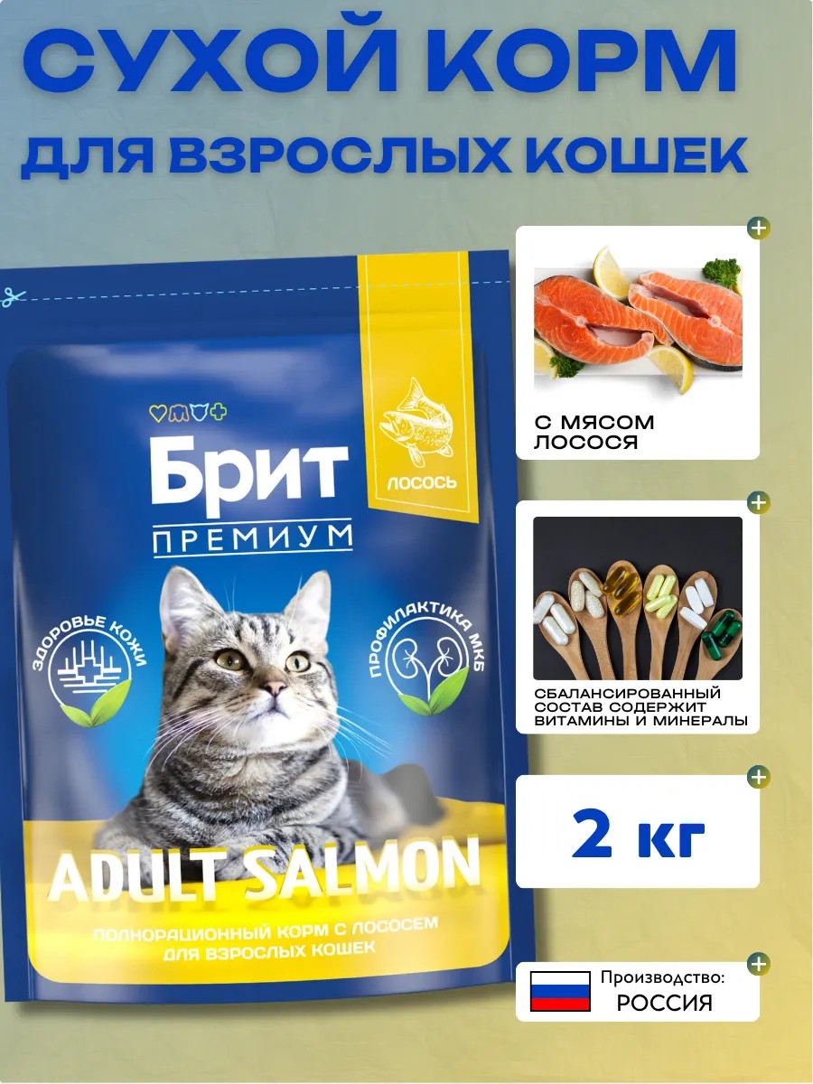 Brit Premium Cat Adult Salmon. Complete premium dry food with salmon for adult cats. Brit Premium dry food with salmon is designed for adult cats of all breeds. Its balanced formula contains all the vitamins and minerals your pet needs for daily healthy nutrition. This food will help maintain your pet's health and activity, while the salmon provides an enticing aroma and taste that will satisfy even the most discerning palates.