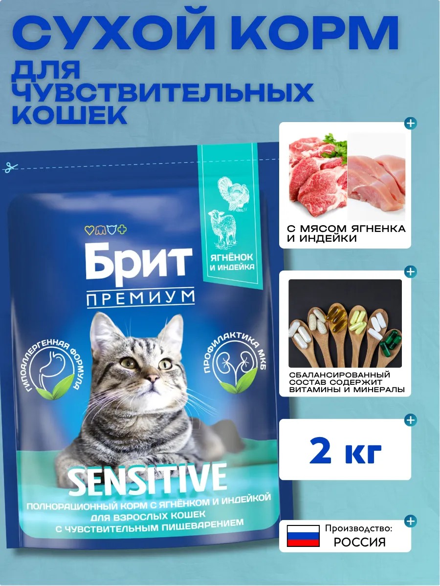 Brit Premium Sensitive. Complete premium dry food with turkey and lamb for adult cats with sensitive digestion. Brit Premium dry food with turkey and lamb is designed for adult cats with sensitive digestion. Its balanced formula contains all the vitamins and minerals your pet needs for daily healthy nutrition. This food will help maintain your pet's health and activity, and the meat in the formula provides an enticing aroma and taste that will satisfy even the most discerning pets.