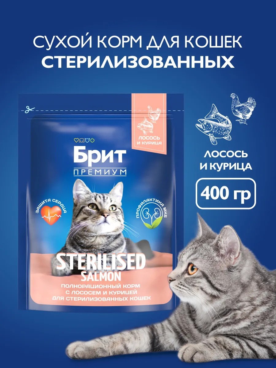 Полнорационный сухой корм премиум-класса с лососем и курицей для взрослых стерилизованных кошек, 0,4 кг. Сбалансированный состав содержит все витамины и минералы, необходимые для ежедневного здорового питания вашего питомца. Корм поможет сохранить здоровье и активность вашего питомца, а мясо в составе обеспечивает притягательный аромат и вкус, который не оставит равнодушным даже самых привередливых питомцев. Корм следует давать сухим или увлажненным теплой водой. У животного всегда должен быть доступ к миске со свежей водой. Важно: При вводе нового корма смешайте его небольшое количество с привычной едой и в течение нескольких дней постепенно увеличивайте количество нового корма. Следуйте рекомендациям по ежедневному питанию, представленным в таблице.