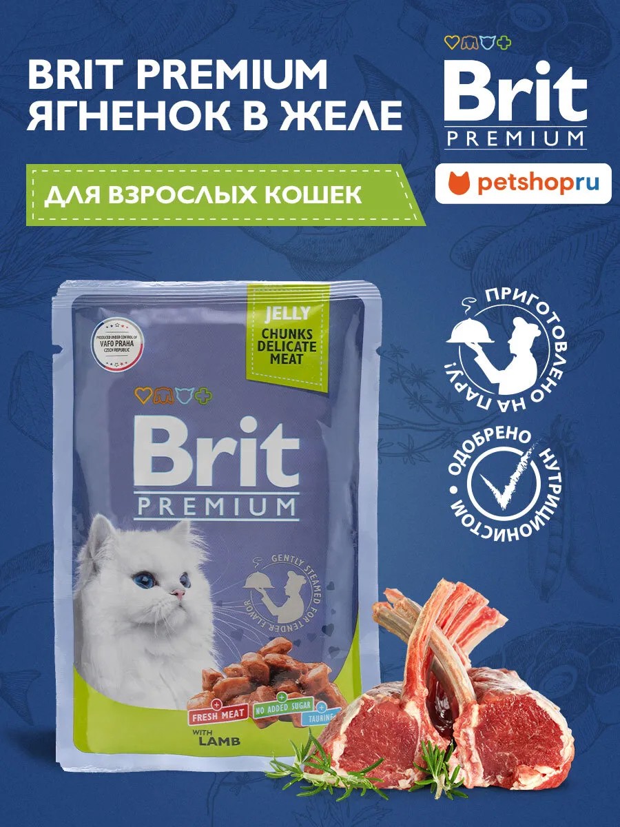 Нежные кусочки ягненка в аппетитном желе - идеальное сочетание для полноценного и сбалансированного рациона. Паучи Brit Premium однозначно заинтересуют вашу кошку и станут для нее любимым блюдом.
