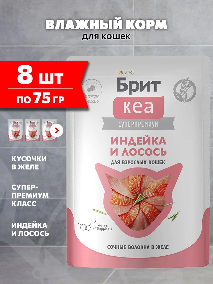 Вся линейка паучей и ламиcтеров Брит Кеа "Волокна в желе" построена на индейке как основном белке, с добавками разных морепродуктов. Это уникальная фишка линейки — моно-белковый состав на базе индейки + сочные волокна и желе, обогащенные спирулиной и таурином, создающие функциональное лакомство для взрослых кошек и котят.