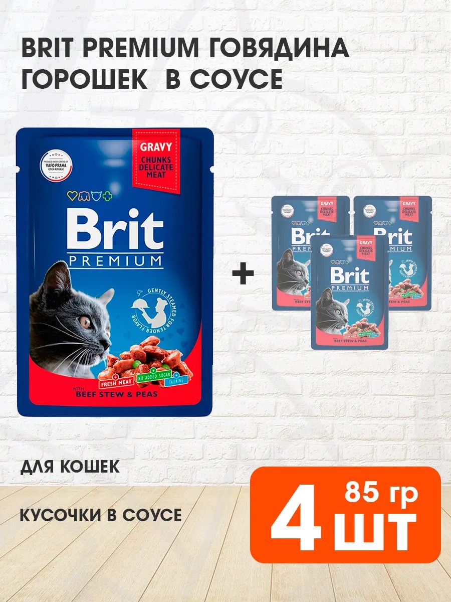 Brit Корм влажный Premium для кошек говядина горох 85 г 4 шт