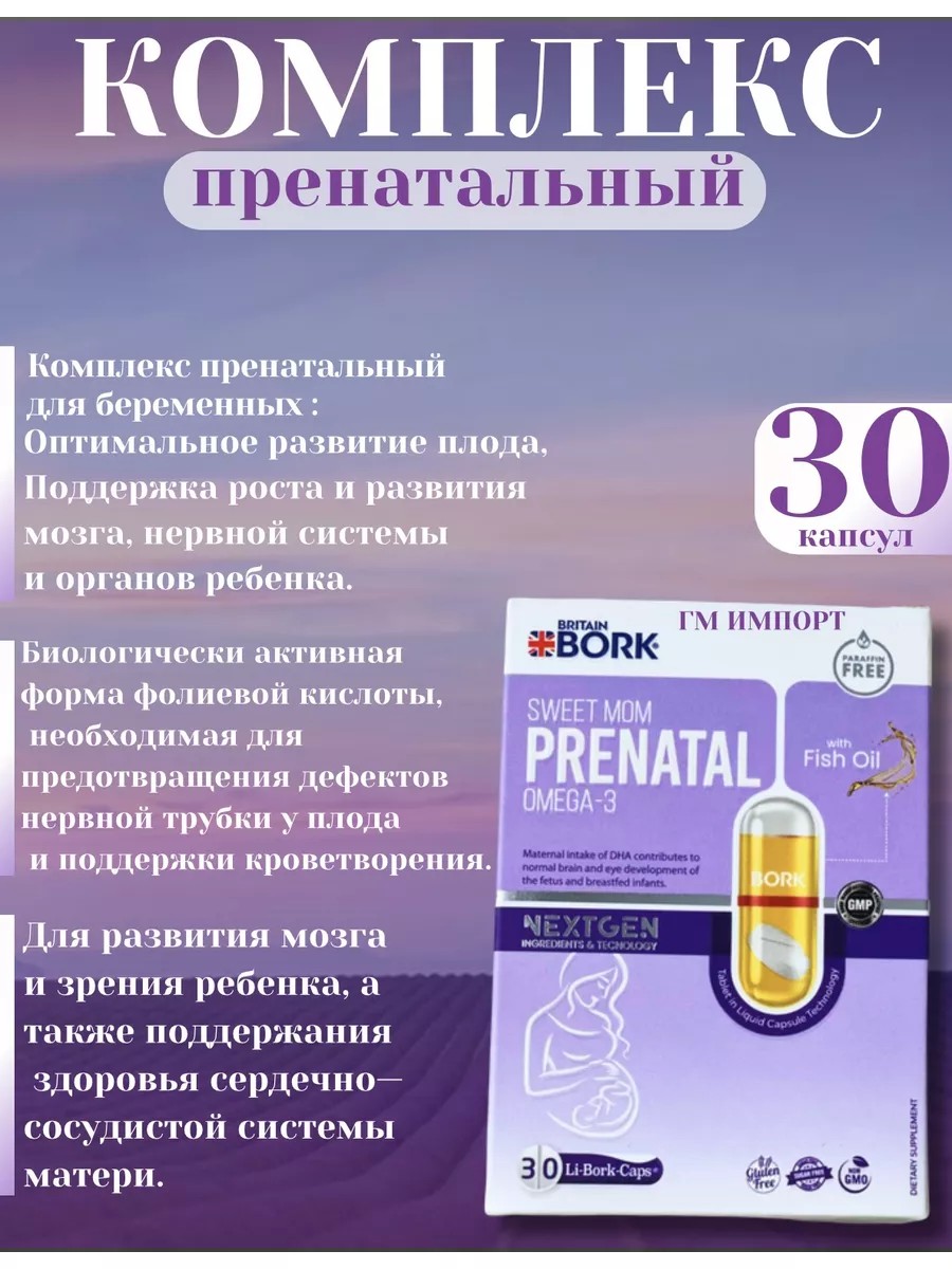| Комплектация | Картонная коробка; Блистеры; 30 капсул с Витаминами и Омега 3 для беременных; Britain bork prenatal |