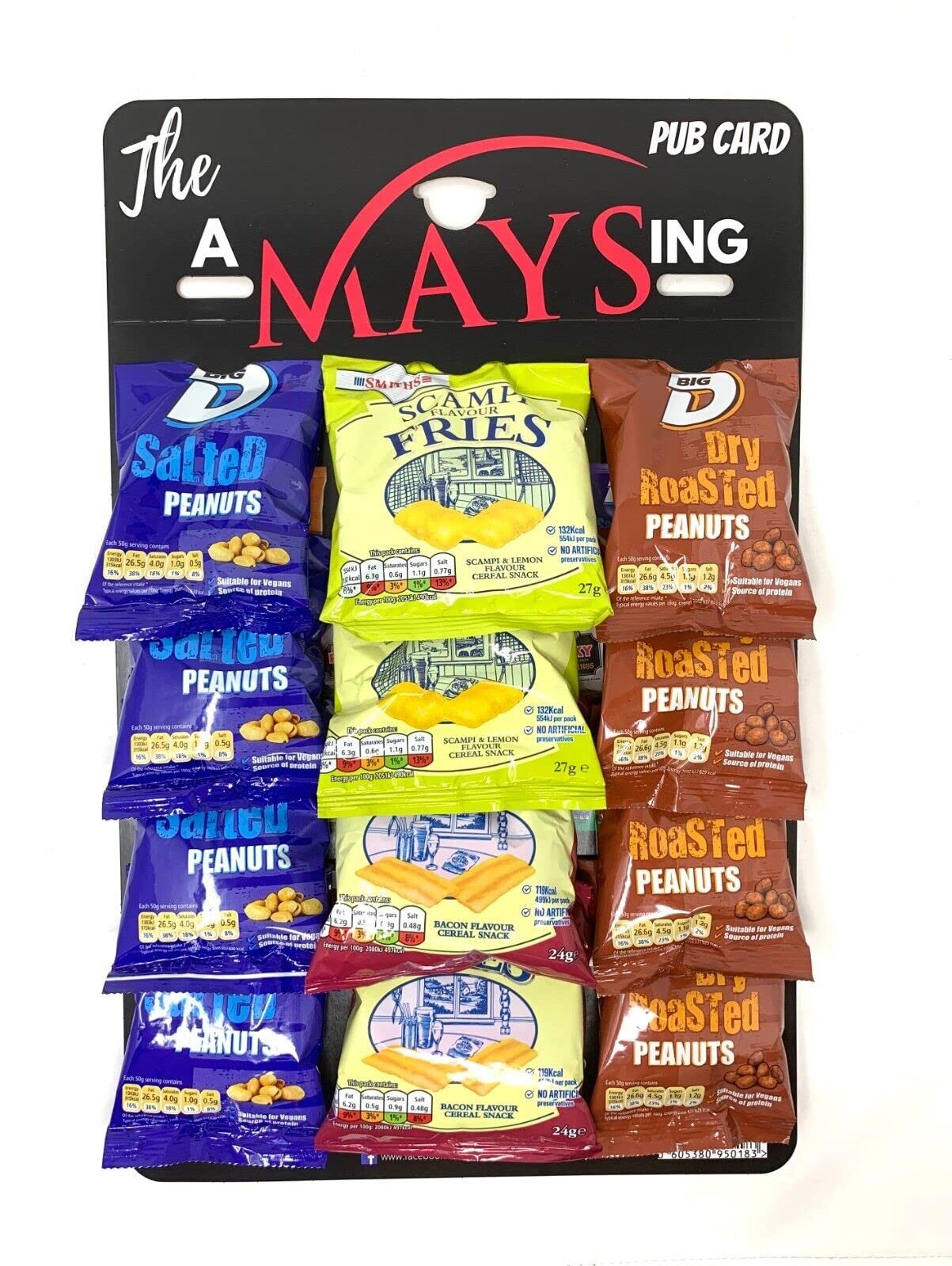 EAN Remains Property Rights of Mays International Group. British Food Shop product exclusive to AMAysing. The 'AMaysing' Bite-Sized 12 Pack Black Pub Snack Card by Mays International Group. Perfect Novelty Treat or Gift for the Snack Lover! A 'Must-Have' for your Home Bar or Pub Garden!. BIG D SALTED DRY ROASTED PEANUTS with SMITHS BACON and SCAMPI FRIES.