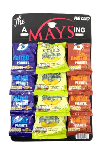 EAN Remains Property Rights of Mays International Group. British Food Shop product exclusive to AMAysing. The 'AMaysing' Bite-Sized 12 Pack Black Pub Snack Card by Mays International Group. Perfect Novelty Treat or Gift for the Snack Lover! A 'Must-Have' for your Home Bar or Pub Garden!. BIG D SALTED DRY ROASTED PEANUTS with SMITHS SCAMPI FRIES.