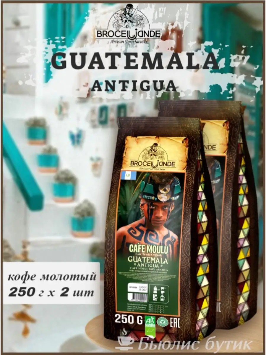 Натуральный кофе молотый 250 г Brocelliande Guatemala Antigua (Броселианд Гватемала Антигуа) зерна 100% арабики. Это лучшие кофейные бобы родом из самой Гватемалы, помол кофе в зернах со вкусом высшего сорта, лучший кофе премиум класса. Сама природа сделала так, что природные условия подходят для выращивания кофейных деревьев и как следствие их зерен. Черный кофе молотый Broceliande Guatemala Antigua, произведенный в Гватемале, по праву считается одним из самых престижных сортов кофе на всей планете. Чёрный кофе Броселлианд 250 гр был выращен на вулканической почве, это сказалось на вкусе напитка, который можно описать, как обладателя пряных, с легким дымком и шоколадными вкусовыми нотками. Экономичная мягкая упаковка с клапаном 250 грамм бережно хранит кофе от внешних неблагоприятных условий. Органический кофе подходит для кофемашины, для гейзерной кофеварки, для турки, для заваривания в чашке. В комплекте поставки: 2 мягких упаковки молотого кофе по 250 грамм.
