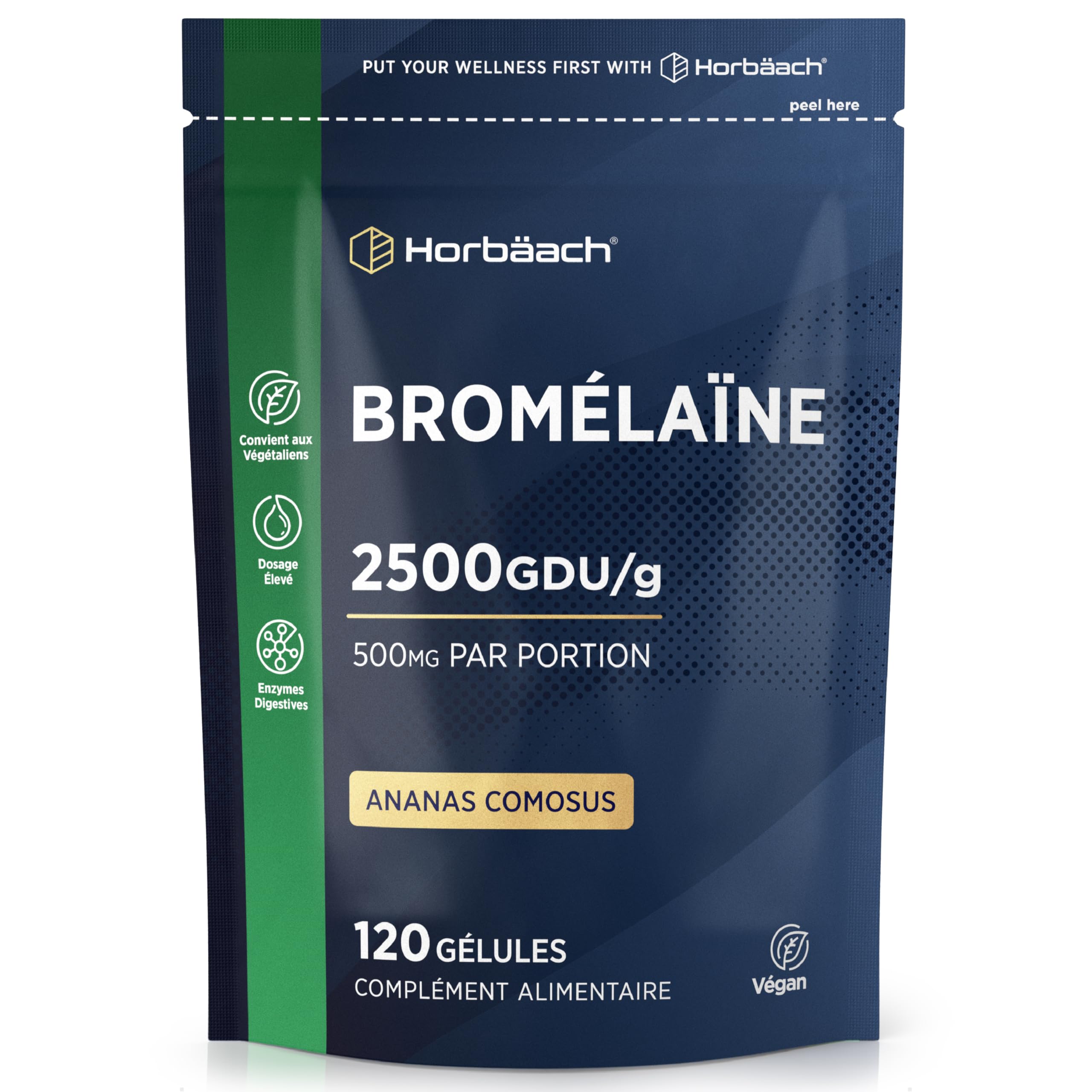 PACKAGING MAY VARY: We are currently updating our packaging. If the product you receive looks different, rest assured that the benefits remain the same. Additionally, if your product is labeled in English, you will find a detachable label that includes six other languages for your convenience. SUITABLE FOR: Horbaach Bromelain contains no soy, wheat, dairy, or preservatives. DYNAMIC DIGESTIVE AID - provides maximum protein digestion and nutrient absorption. OPTIMAL ABSORPTION - provides 500 mg of bromelain (pineapple enzyme) per serving. PURE SUPPORT - our natural formula contains high-quality bromelain, naturally found in pineapples.