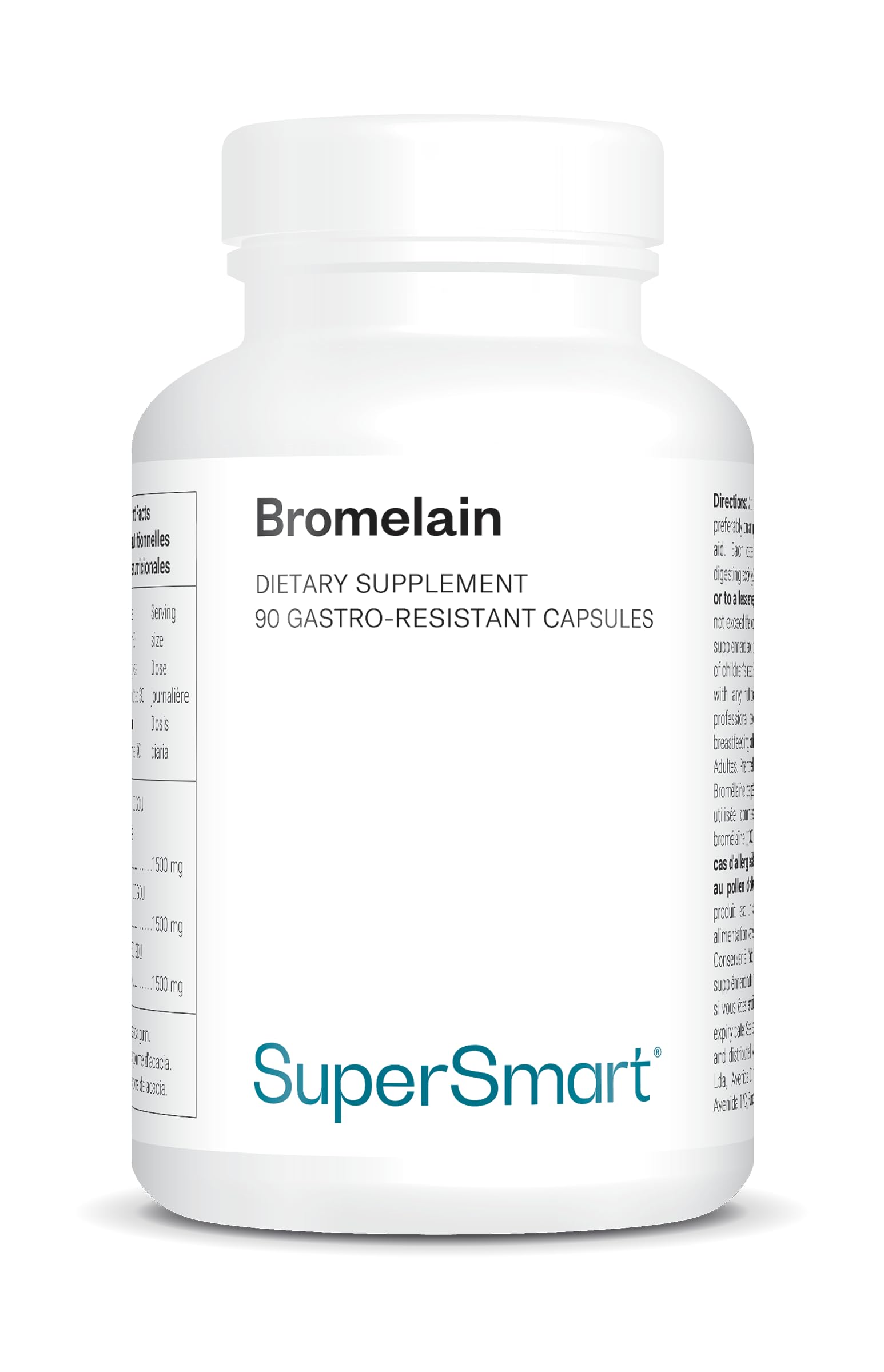 SATISFACTION GUARANTEED: We strive to offer you a range of highly effective products, along with exceptional customer service. If you have any questions or concerns, please don't hesitate to contact us at any time. We're here to help you become the best version of yourself. DIRECTIONS FOR USE: Take 1 to 3 capsules daily, or as directed by your doctor. Preferably on an empty stomach, unless used as a digestive aid. This product is a nutritional supplement and should not be used as a substitute for a balanced and varied diet or a healthy lifestyle. NATURAL INGREDIENTS: Pineapple stem extract. Vegan and gluten-free formula! At Supersmart, we choose raw materials rich in active ingredients. We also prioritize eco-responsible practices and natural excipients. PINEAPPLE TO FIGHT INFLAMMATION: Feeling tired of battling chronic inflammation? Discover Bromelain 500 mg, the bromelain food supplement that can help reduce inflammation and support your immune system. It's the secret weapon you've been looking for to help you feel better. ? SUPERSMART: With over 30 years of expertise, we are one of the leading brands in Europe to market food supplements. Our formulas are developed by an in-house team of specialists. With hundreds of thousands of satisfied customers, SUPERSMART is a key player in nutritional supplementation.SATISFACTION GARANTIE : Nous mettons tout en œuvre pour vous proposer une gamme de produits hautement efficaces, tout en vous offrant un service client exceptionnel. Si vous avez des questions ou des préoccupations, n'hésitez pas à nous contacter à tout moment. Nous sommes là pour vous aider à devenir la meilleure version de vous-même. CONSEIL D'UTILISATION : Prendre de 1 à trois 3 gélules par jour ou selon les conseils de votre médecin. De préférence à jeun, à moins qu'elle ne soit utilisée comme aide digestive. Ce produit est un supplément nutritionnel et ne doit pas être utilisé en remplacement d'une alimentation équilibrée et variée, ni d'un mode de vie sain. DES INGRÉDIENTS NATURELS : Extrait de la tige d'ananas. Formule vegan et sans gluten ! Chez Supersmart, nous choisissons des matières premières riches en ingrédients actifs. Nous privilégions aussi les démarches éco-responsables et les excipients naturels. DE L'ANANAS POUR LUTTER CONTRE L'INFLAMMATION : Sentez-vous fatigué(e) de vous battre contre l'inflammation chronique ? Découvrez Bromelain 500 mg, le complément alimentaire de bromelaïne qui peut aider à réduire l'inflammation et soutenir votre système immunitaire. C'est l'arme secrète que vous cherchiez pour vous aider à vous sentir mieux. ? SUPERSMART : 30 ans d'expertise, nous sommes l'une des premières marques en Europe à commercialiser des compléments alimentaires. Nos formules sont mises au point par une équipe de spécialistes en interne. Avec des centaines de milliers de clients satisfaits, SUPERSMART figure comme un acteur incontournable de la supplémentation nutritionnelle.Bromelaïne - Enzyme Anti-Inflammatoire - Extraite de la Tige de l'Ananas - Soutient le Système Immunitaire - Aide à la Digestion et à la Récupération - DrCaps - Vegan - Supersmart