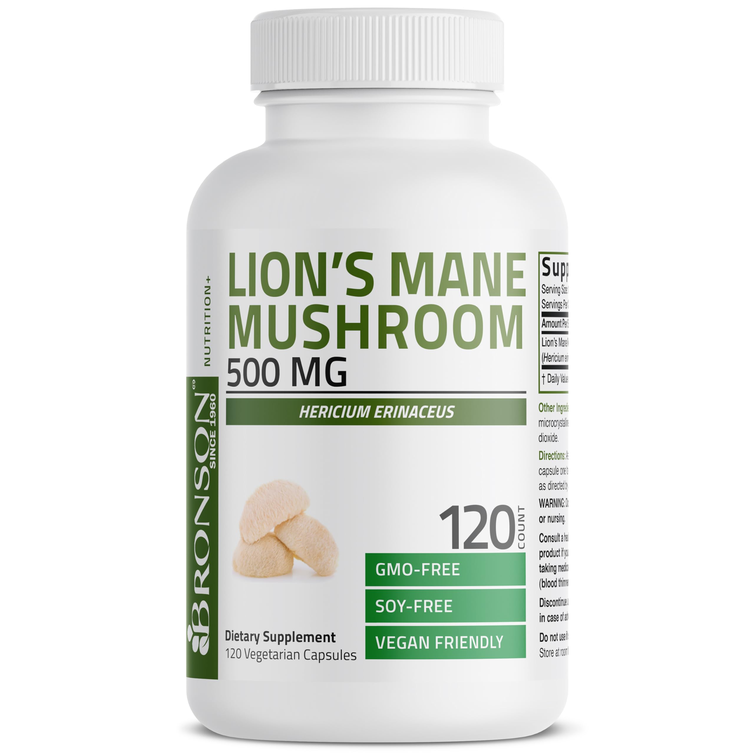 Bronson Lion's Mane Mushroom Capsules are in-house laboratory tested and free of GMOs and Soy. Lion's Mane Mushroom 500 MG is carefully manufactured by trained professionals in our state-of-the-art facility that is located in Hauppauge, New York.