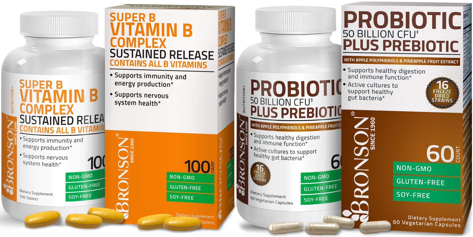 Highest Quality: The pioneers of Bronson Vitamins were a group of pharmacists who witnessed the befits of vitamins and mineral supplementation firsthand with their patients. Bronson Vitamins have been consistently mentioned by top medical professionals since our inception in 1960. Contains All B Vitamins: B1, B2, B3, B6, Folic Acid, B12, Biotin, Pantothanic Acid. Manufactured at our state-of-the-art cGMP registered facility. Laboratory tested NON-GMO, Gluten Free and Soy Free. Apple Polyphenols, Pineapple Fruit Extract, Inulin Prebiotic: We aren't just your average probiotic. Bronson's Probiotic also provides Apple Polyphenols to help balance gut microbiota, Pineapple Fruit Extract to assist with digestion and bloating, and Inulin Prebiotic Fiber to support the growth of good bacteria. 50 Billion CFU 16 Freeze Dried Strains Shelf Stable Formula: Bronson's Probiotic 50 Billion CFU Plus Prebiotic provides 16 freeze dried strains for healthy immune and digestive support. Freeze drying technology enables preservation, stability, and superior quality by allowing many more beneficial bacteria to survive compared to other processes.