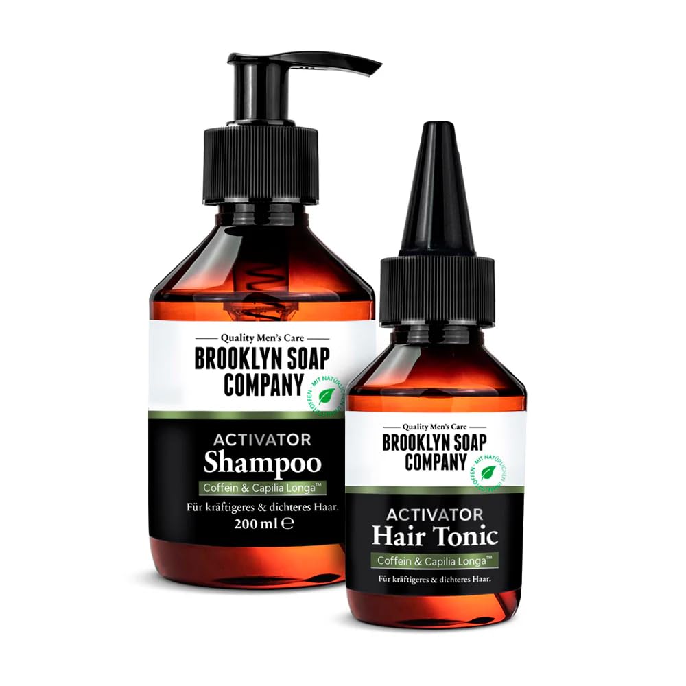 Brooklyn Soap Company Activator Hair Bundle – the 2-step routine for fuller, stronger hair. Hair loss can have many causes: the Activator Hair Bundle places exactly where your hair needs support. The combination of Activator Hair Shampoo and Activator Hair Tonic provides your hair roots with important nutrients, promotes natural hair growth and strengthens the hair structure from within. The effective formula with caffeine, Capilia Longa and biotin activates the hair follicles, improves nutrient absorption and demonstrably reduces hair loss. In addition, panthenol and niacinamide care for the scalp, soothe irritations and ensure an optimal moisture balance. The result: healthier, denser and stronger hair in just 150 days. The use is simple and ideal for daily hair care: gently massage the shampoo into the scalp and rinse thoroughly to remove deposits and activate the hair roots. Then apply the tonic directly to the scalp and do not rinse, so that the active ingredients unfold their full power. Ready for stronger hair? Start your 2-step routine now! ( Commodity study with Capilia Longa on 40 subjects for 150 days with daily use.) INGREDIENTS Activator Hair Shampoo INCI: aqua, sodium coco-sulfate, coco-Glucoside, cocamidopropyl betaine, glycerin, caffeine, maris sal, panthenol, citric acid, glyceryl oleate, curcuma longa callus conditioned media, hydroxypropyl guar, hydroxypropyltrimonium chloride, niacinamide, linoleic ais. cid, pentyl. a glycol, olenic acid, biotin, palmitic acid, stearic acid, linoleic acid, phytic acid, tocopherol, hydrogenated vegetable glycerides citrate, sodium benzoate, potassium sorbate, perfume, linalool. Activator Hair Tonic INCI: Aqua, alcohol denat, glycerin, panthenol, caffine, curcuma longa callus conditioned media, niacinamide, pentylene-removed comma glycol, biotin, physiic acid INSTRUCTIONS FOR USE Gently massage the 1st Shampoo into the scalp and rinse thoroughly. 2nd Then apply the tonic directly to the scalp and do not rinse. SAFETY WARNING For external use only. Avoid direct contact with the eyes. In case of contact with eyes, rinse with water. Keep out of the reach and sight of children. See moreEasy daily use: gently massage shampoo and rinse thoroughly. Then apply the tonic to the scalp and do not rinse to benefit from the stimulating effect. Scientifically proven formula: denser and stronger hair in 150 days – with visible results (research on raw materials with Capilia Longa on 40 subjects for 150 days with daily use). Strengthens the hair structure and reduces hair loss: the active formula stimulates blood circulation, extends the life of the hair fibers and supports healthy hair density. With proven active ingredients: caffeine, caffeine and biotin provide the hair roots with important nutrients, while panthenol and niacinamide soothe and care for the scalp. The 2-step routine for fuller hair: the Activator Hair Bundle combines shampoo tonic for targeted care against hair loss and visible hair growth.Brooklyn Soap Company Activator Hair Bundle Shampoo 200 ml Hair Tonic 100 ml – haargroei stimuleren en haaruitval tegengaan – haargroeiset voor de dagelijkse haarverzorging Brooklyn Soap Company Activator Hair Bundle – de 2-stappen routine voor voller, sterker haar. Haaruitval kan vele oorzaken hebben: de Activator Hair Bundle zet precies daar waar je haar ondersteuning nodig heeft. De combinatie van Activator Hair Shampoo en Activator Hair Tonic voorziet je haarwortels met belangrijke voedingsstoffen, bevordert de natuurlijke haargroei en versterkt de haarstructuur van binnenuit. De effectieve formule met cafeïne, Capilia Longa en biotine activeert de haarzakjes, verbetert de opname van voedingsstoffen en vermindert aantoonbaar haaruitval. Bovendien verzorgen panthenol en niacinamide de hoofdhuid, kalmeren irritaties en zorgen voor een optimale vochtbalans. Het resultaat: gezonder, dichter en sterker haar in slechts 150 dagen. Het gebruik is eenvoudig en ideaal voor dagelijkse haarverzorging: masseer de shampoo zachtjes in de hoofdhuid en spoel grondig uit om afzettingen te verwijderen en de haarwortels te activeren. Vervolgens de tonic direct op de hoofdhuid aanbrengen en niet uitspoelen, zo ontvouwen de werkzame stoffen hun volledige power. Klaar voor sterker haar? Start nu je routine in 2 stappen! ( Grondstoffenstudie met Capilia Longa bij 40 proefpersonen gedurende 150 dagen bij dagelijks gebruik.) INGREDIËNTEN Activator Hair Shampoo INCI: aqua, natriumcoco-sulfaat, coco-Glucoside, cocamidopropyl betaïne, glycerine, cafeïne, maris sal, panthenol, citric acid, glyceryloleaat, curcuma longa callus conditioned media, hydroxypropyl guar, hydroxypropyltrimonium chloride, niacinamide, linoleic ais. cid, pentyl. een glycol, oleenzuur, biotine, palmitisch zuur, stearische zuur, linolenzuur, fytisch zuur, tocoferol, gehydrogeneerde plantaardige glyceriden citraat, natriumbenzoaat, potassiumsorbaat, parfum, linalool. Activator Hair Tonic INCI: Aqua, alcoholdenat, glycerine, panthenol, caffijn, curcuma longa callus conditioned media, niacinamide, pentyleen-verwijderde comma glycol, biotine, fysizuur GEBRUIKSAANWIJZING 1ste Shampoo zachtjes in de hoofdhuid inmasseren en grondig uitspoelen. 2de Vervolgens de tonic direct op de hoofdhuid aanbrengen en niet uitspoelen. VEILIGHEIDSWAARSCHUWING Alleen voor uitwendig gebruik. Vermijd direct contact met de ogen. Bij contact met de ogen met water uitspoelen. Buiten het bereik en zicht van kinderen houden. Meer bekijkenEenvoudig dagelijks gebruik: shampoo zachtjes inmasseren en grondig uitspoelen. Vervolgens de tonic op de hoofdhuid aanbrengen en niet uitspoelen om van de stimulerende werking te profiteren. Wetenschappelijk bevestigde formule: in 150 dagen dichter en sterker haar – met zichtbare resultaten (onderzoek naar grondstoffen met Capilia Longa bij 40 proefpersonen gedurende 150 dagen bij dagelijks gebruik). Versterkt de haarstructuur en vermindert haaruitval: de actieve formule stimuleert 
