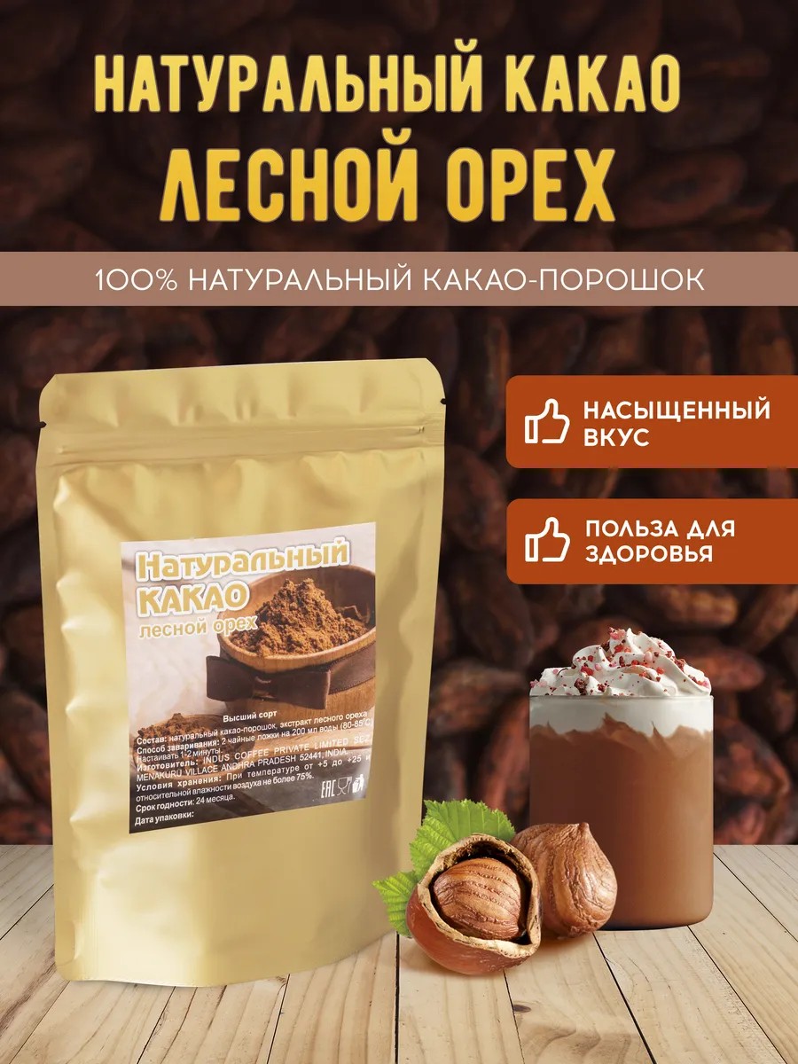 Натуральный какао-порошок из обжаренных какао-бобов с добавление экстракта лесных орехов.