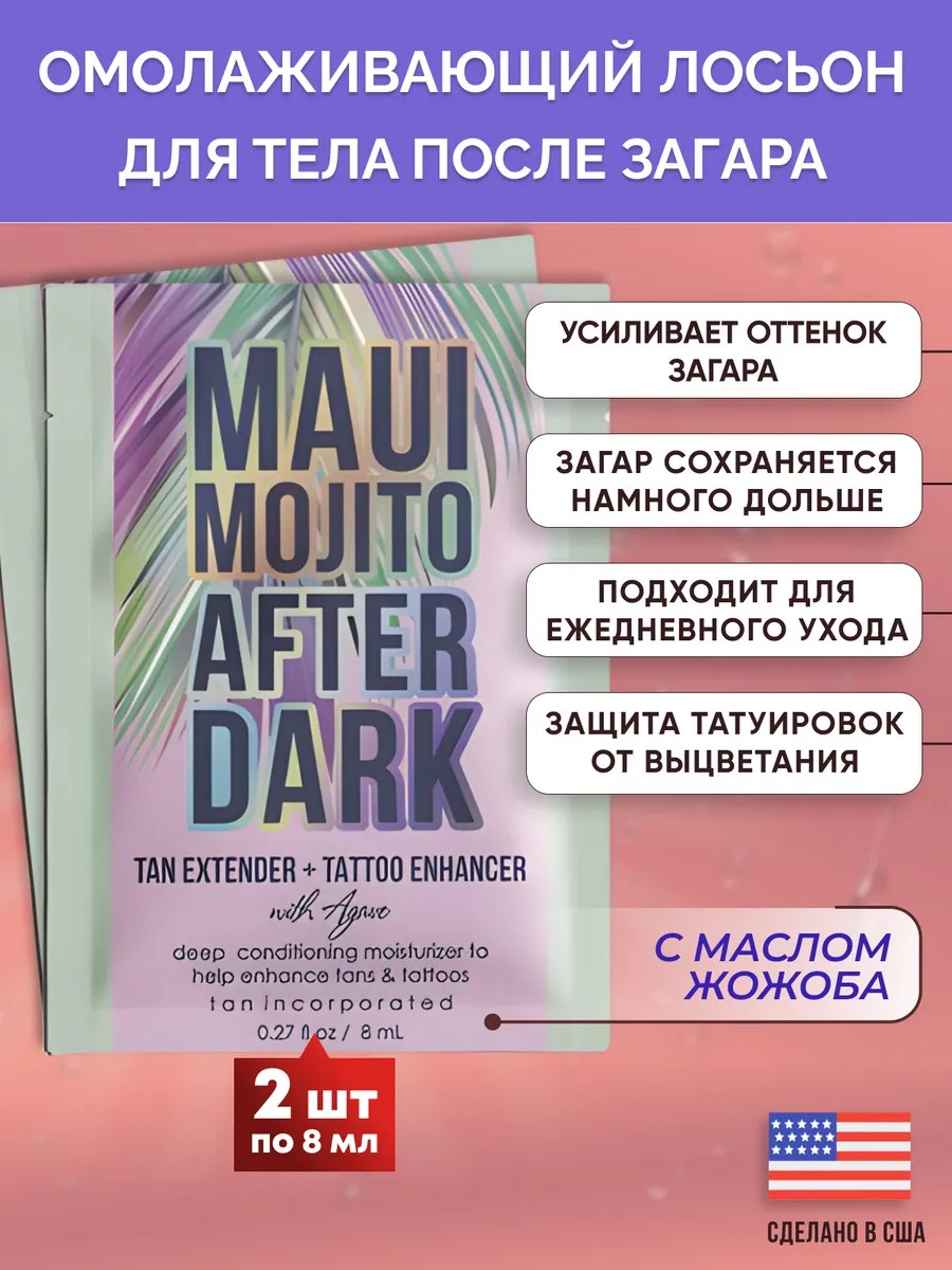 The creamy texture is instantly absorbed without leaving a greasy film, leaving skin velvety smooth. The tropical scent of "Maui Mojito" is fresh and invigorating with notes of lime, mint, and tropical fruits, giving a feeling of freshness and immersing you in the atmosphere of an oceanside vacation. How to use: Apply to clean, dry skin daily after a shower or bath. Use after tanning for maximum hydration and prolongation of color.