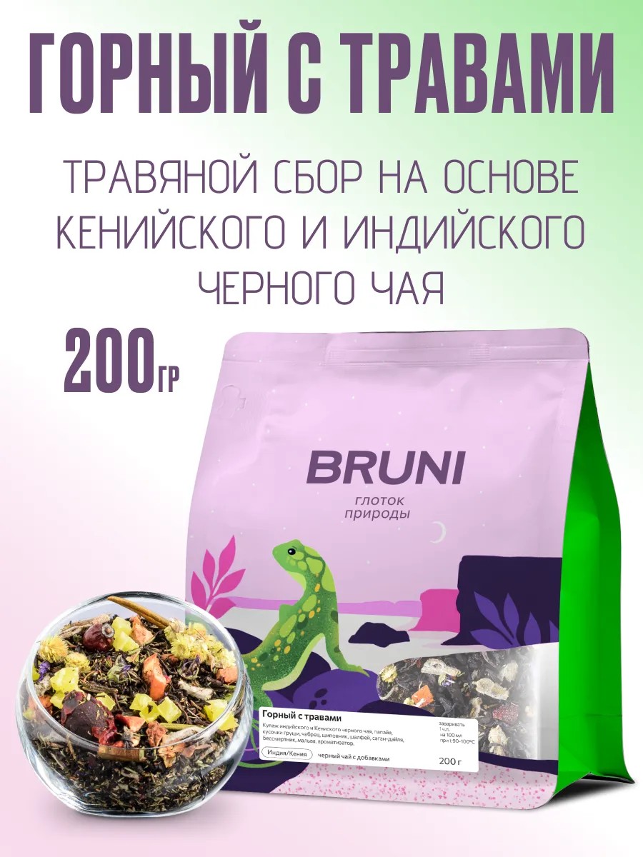 Чай черный горный с травами Bruni — это уникальная композиция из индийского и кенийского черного чая, обогащенная полезными травами и фруктами. Яркий вкус с нотками ягод, фруктов и трав подарит вам истинное наслаждение и создаст неповторимую атмосферу уюта. В его состав входят папайя, груша, чабрец, шиповник, шалфей, саган-дайля, бессмертник и мальва, что придает чаю не только приятный аромат, но и ценные свойства. Чай Bruni не содержит ГМО, ароматизаторов и усилителей вкуса, что делает его идеальным выбором для ценителей натуральных продуктов.