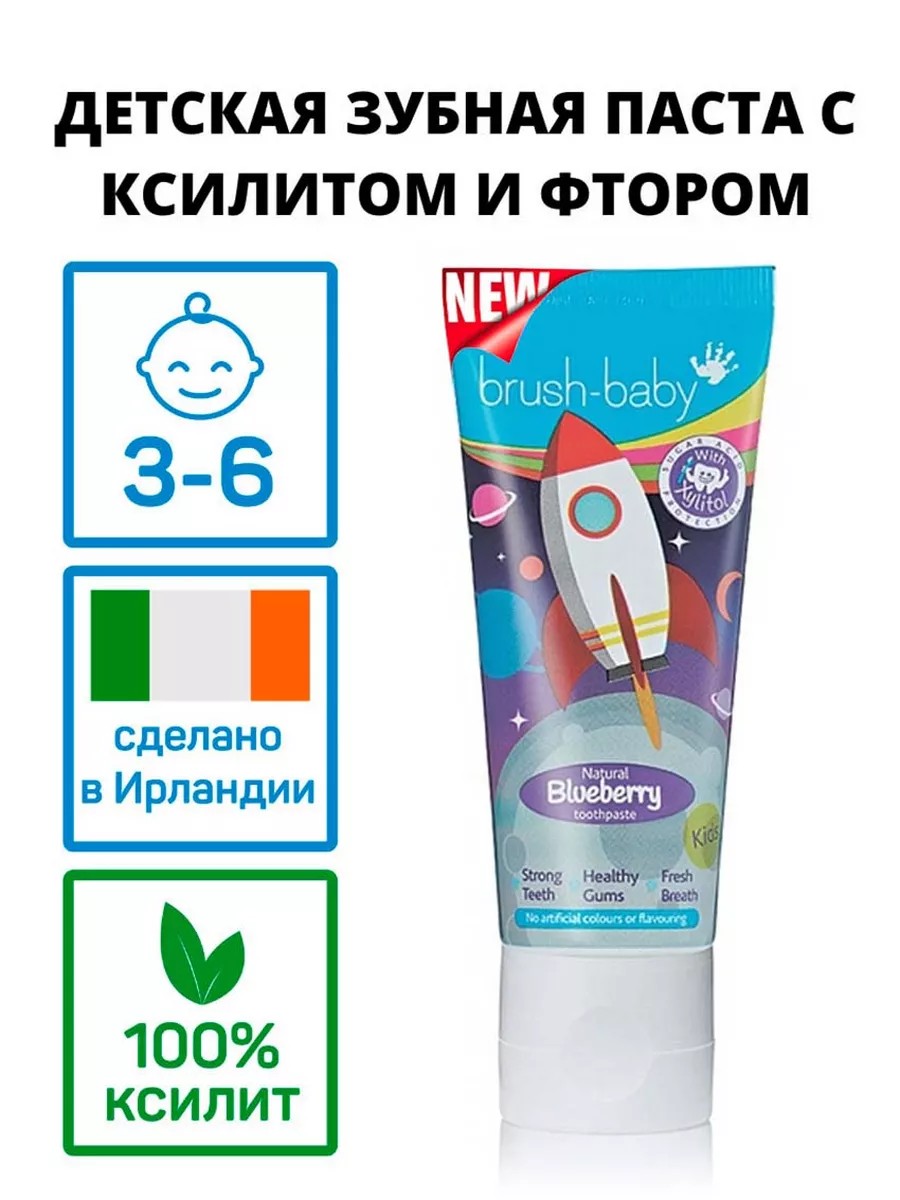 Brush Baby Blueberry Children's Toothpaste is designed for children aged 3 to 6 years. Brush Baby toothpaste is recommended by pediatric dentists. The main ingredients are the antibacterial component xylitol and fluoride. Xylitol removes plaque and destroys caries-causing Streptococcus mutans bacteria. Xylitol is considered one of the safest means of preventing caries, because, unlike other bacteriostatic products, it has no side effects and does not cause dysbiosis or enamel darkening. Fluoride actively restores and strengthens the thin enamel of baby teeth and promotes remineralization of dental tissue, reliably protecting against caries and other decay. This toothpaste contains 1350 ppm fluoride. Brush Baby Blueberry Children's Toothpaste 3-6 does not contain parabens, sodium lauryl sulfate, or GMOs. Tube volume: 50 ml.