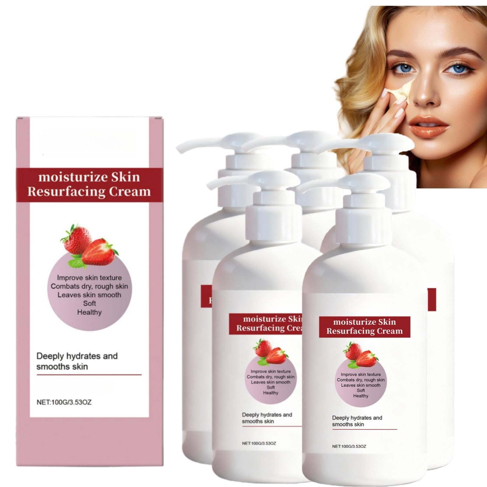 DESCRIPTION DU PRODUIT DESCRIPTION DU PRODUIT Strawberry Brightening Cream for Dark Spots Uneven Tone - Softening Lotion for Women Men (Face, Legs, Arms, Neck) to Smooth Rough Bumpy Skin, Fade Uneven Tone Lock in Long-Lasting Moisture, Rough Bumpy Skin Body Cream How To Use: 1.Cleanse and dry your skin. 2.Apply an appropriate amount evenly to your skin and massage gently until absorbed Specification: Item Name: Strawberry Skin Cream Net Content: 100G Shelf Life: 3 Years Package Includes: 1 3 5 Bottles Strawberry Skin Cream 100g NOTE: 1.Please allow 1-2cm differs due to manual measurement. 2.Due to the different display and different light, the picture may not show the actual color of the item. AVERTISSEMENT DE SÉCURITÉ Store in cool dry place way from sunlight. Keep out of reach of children.Gentle and Effective Formulation: This strawberry brightening cream is free of irritating additives, making it ideal for daily moisturizing and providing targeted care for strawberry skin and dullness – leaving no heavy residue, only comfortable nourishment. Multi-Purpose for Face and Body: Suitable for all skin types, this cream can be used on legs, arms, neck, and face. It effectively softens rough skin, repairs dryness, and provides daily use to keep skin hydrated. Gentle Smoothing, Even Skin Tone: Niacinamide helps improve uneven skin texture and fade pigmentation, while strawberry extracts brightens the complexion, resulting in a smooth and even skin tone. Deep Hydration, Revitalizing Skin: This lightweight, moisturizing body lotion effectively hydrates dry skin, while locks in moisture, keeping skin smooth all day – an ideal choice for daily moisturizing. Comprehensive Care: Enriched with strawberry extracts and brightening niacinamide, this body lotion effectively improves strawberry legs, rough bumpy skin, and dark spots, leaving skin with a healthier glowing.Strawberry Skin Resurfacing Cream - Lotion hydratante pour les jambes de fraise et la peau de poulet, Crème visage éclairante, Crème hydratante quotidienne pour les peaux rugueuses et bossées (5)DESCRIPTION DU PRODUIT DESCRIPTION DU PRODUIT Strawberry Brightening Cream for Dark Spots Uneven Tone - Softening Lotion for Women Men (Face, Legs, Arms, Neck) to Smooth Rough Bumpy Skin, Fade Uneven Tone Lock in Long-Lasting Moisture, Rough Bumpy Skin Body Cream How To Use: 1.Cleanse and dry your skin. 2.Apply an appropriate amount evenly to your skin and massage gently until absorbed Specification: Item Name: Strawberry Skin Cream Net Content: 100G Shelf Life: 3 Years Package Includes: 1 3 5 Bottles Strawberry Skin Cream 100g NOTE: 1.Please allow 1-2cm differs due to manual measurement. 2.Due to the different display and different light, the picture may not show the actual color of the item. AVERTISSEMENT DE SÉCURITÉ Store in cool dry place way from sunlight. Keep out of reach of children.Gentle and Effective Formulation: This strawberry brightening cream is free of irritating additives, making it ideal for daily moisturizing and providing targeted care for strawberry skin and dullness – leaving no heavy residue, only comfortable nourishment. Multi-Purpose for Face and Body: Suitable for all skin types, this cream can be used on legs, arms, neck, and face. It effectively softens rough skin, repairs dryness, and provides daily use to keep skin hydrated. Gentle Smoothing, Even Skin Tone: Niacinamide helps improve uneven skin texture and fade pigmentation, while strawberry extracts brightens the complexion, resulting in a smooth and even skin tone. Deep Hydration, Revitalizing Skin: This lightweight, moisturizing body lotion effectively hydrates dry skin, while locks in moisture, keeping skin smooth all day – an ideal choice for daily moisturizing. Comprehensive Care: Enriched with strawberry extracts and brightening niacinamide, this body lotion effectively improves strawberry legs, rough bumpy skin, and dark spots, leaving skin with a healthier glowing.