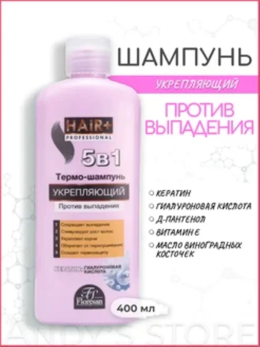 Термо-шампунь укрепляющий против выпадения волос - это деликатное очищение и интенсивное восстановление ослабленных волос в одной флаконе. Профессиональная формула шампуня с кератином и гиалуроновой кислотой работает сразу в пяти направлениях укрепляет корни, сокращает выпадения и стимулирует рост волос, увлажняет и создает темрозащиту. Кератин восстанавливает повреждения, укрепляет волосы. Гиалуроновая кислота увлажняет и предохраняет волосы от пересушивания. Аминокислота Тирозин создает термозащиту, предохраняя волосы от потери эластичности, исключая ломкость и повреждения волос в процессе укладки. Гидролизованный шелк придает волосам мягкость, гладкость и блеск. Результат - волосы более устойчивы к выпадению, объемные, блестящие и легко расчесываются. Большего и лучшего эффекта вы сможете достигнуть, используя данный шампунь вместе с несмываемым крем-спреем для волос 15 в 1
