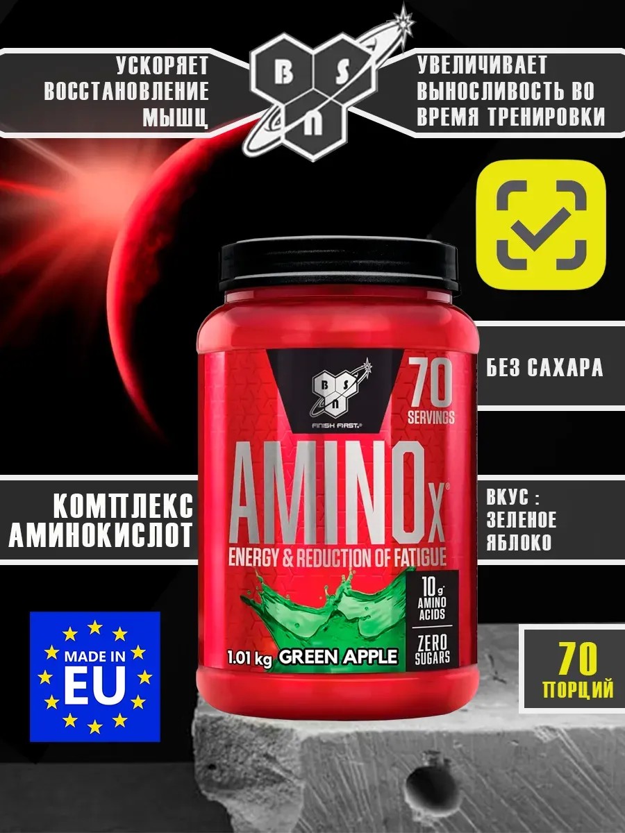 ATTENTION! Please note that this Amino-X is manufactured in Europe by this brand! Country: Ireland. It differs from the American version in that it contains vitamin B6 and arginine, but lacks citrulline and sodium! Amino X, an effervescent, fast-dissolving amino acid complex, is manufactured by BSN for athletes looking to build muscle. Unlike most BCAA amino acids, it dissolves easily in liquid, even with a spoon. The supplement also has a pleasant, refreshing taste and combines the benefits of tablet and liquid forms. The main components are 6 amino acids (including BCAA), supplemented with vitamins D and B6. Taking the supplement improves muscle protein synthesis, accelerates post-workout recovery, slows muscle catabolism, and enhances athletic performance. BSN Amino X is a high-quality amino acid supplement that offers the following benefits: 1. Stimulates muscle protein production. 2. Increase endurance and strength. 3. Reduce post-workout recovery. 4. Reduce muscle fatigue. 5. Maintain muscle mass by preventing its breakdown. 6. Restore optimal glycogen levels. A serving of Amino X BSN contains 10 grams of amino acids, including 3 BCAAs. Vitamin D promotes their absorption, which also stimulates testosterone synthesis, strengthens bones, and supports normal muscle function. Free amino acids and BCAAs initiate anabolic processes in the body, enhance protein production, and prevent muscle breakdown, promoting rapid and effective muscle recovery after intense exercise. They remove ammonia and other toxic substances from the body, which contributes to increased performance. It is also advisable to take Amino X for energy, as the supplement contains taurine, which delays the onset of fatigue and increases endurance. Thanks to the absence of caffeine and sugar, the Amino-X amino acid complex can be taken at any time of the day, and its refreshing taste will delight any athlete. Mix one scoop (14.5 g) with 200-350 ml of water. Optimal time of use: before, during and/or after training. Composition per 14.5 g serving: Energy value - 51 kcal, Sugar - 0 g, Vitamin D - 2.5 mcg, Vitamin B6 - 0.49 mg, Amino acids - 10 g (BCAA - 4 g: L-Leucine - 2 g, L-Isoleucine - 1 g, L-Valine - 1 g), Alanine - 3.5 g, Taurine - 2.5 g, Arginine - 45 mg. Ingredients: Branched-Chain Amino Acid Blend (L-Leucine, L-Isoleucine, L-Valine, Emulsifier (Soy Lecithin)), L-Alanine, Taurine, Citric Acid, Malic Acid, Flavorings, Acidity Regulator (Sodium Bicarbonate), Anti-Caking Agent (Silicon Dioxide), Colorings, Sweeteners (Sucralose, Acesulfame Potassium), L-Arginine, Pyridoxine Hydrochloride, Cholecalciferol.