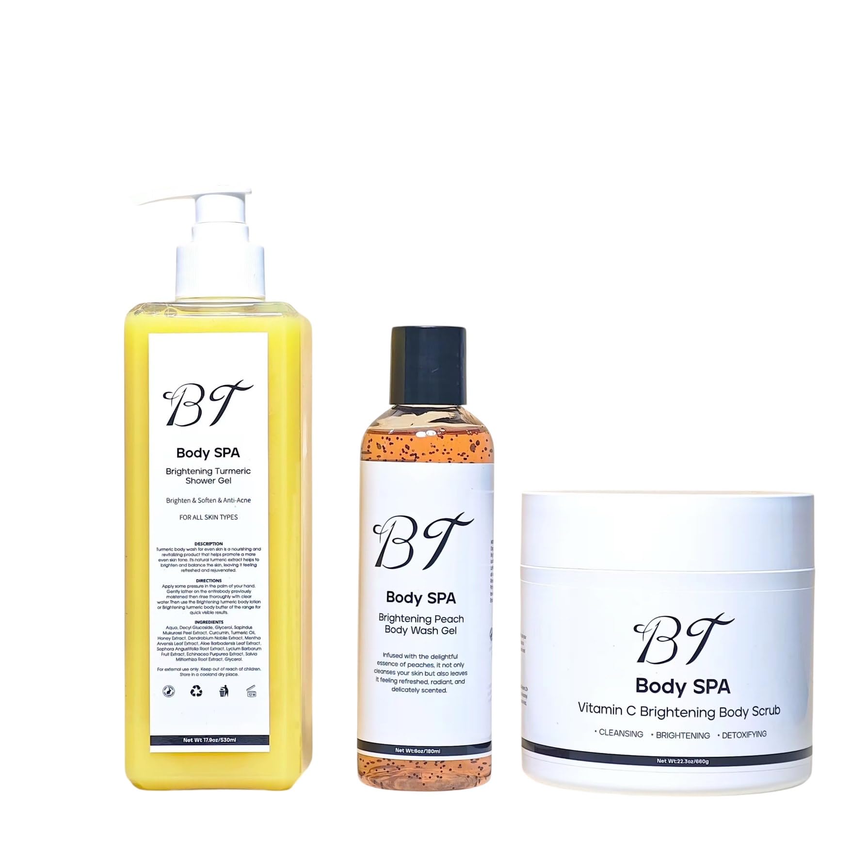 BT Body Spa Exfoliating Body Care Set Vitamin C Body Scrub Peach Gel Body Wash & Turmeric Body Wash for Smooth Glowing Skin.