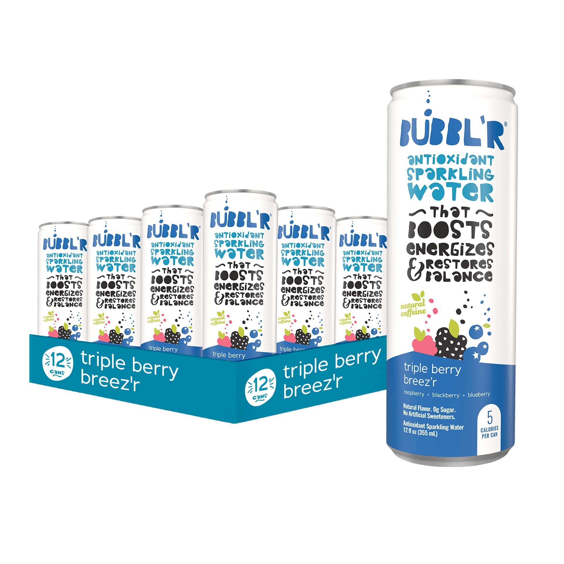 BUBBL'R triple berry breez'r, Antioxidant Sparkling Water with Natural Caffeine, 0g Sugar, Gluten Free, All Natural Flavors, 12 Fl Oz Cans, 12 Count triple berry breez'r 12 Fl Oz (Pack of 12)