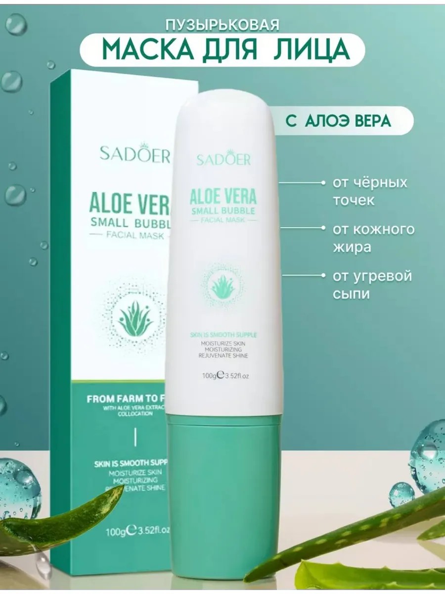 Пузырьковая маска для лица с алоэ Sadoer удаляет черные точки, снимает воспаления, обладает заживляющим эффектом, восстанавливает клетки. Очищающая, увлажняющая маска для лица из натуральных ингредиентов и витаминов в составе, активно работает против черных точек, подкожных высыпаний: угревой сыпи, акне, постакне: масло жожоба, экстракт овса, уголь, каолин, экстракт гамамелиса и другие компоненты и ничем не уступает маске для лица корея. Способ применения маски для лица от черных точек: после очистки кожи лица от загрязнений и декоративной косметики ложечкой наносим пузырьковую массу на очищенную лицо равномерно: на нос, подбородок, лоб, щеки, не затрагивая область вокруг глаз, зону бровей и губ. После образования легкой пены аккуратно массируем кожу в течение 1 минуты. Через 15 минут смыть маску теплой водой. Уходовая маска-органик очищает, питает, увлажняет, работает как активатор и стимулятор чистоты, красоты, здорового вида, гладкости кожи. Для всех типов кожи: нормальной, жирной, сухой, комбинированной, чувствительной, проблемной кожи. Профессиональная угольная маска заменит поход в салон, ее можно наносить дома днем, вечером после душа, чтобы активные beauty-компоненты работали всю ночь, очищая кожу, делая ее свежей, здоровой, гладкой. Использовать маску для лица 2-3 раза в неделю. Эффективную помощь проблемной коже можно совмещать с антивозрастными, разглаживающими, омолаживающими масками для лечения и укрепления кожи, в комплексе с восстанавливающими, увлажняющими, питательными тканевыми масками, с патчами на основе алоэ и патчами для удаления прыщей, пилинг-кремами от постакне, с разогревающим/успокаивающим тоником, с сывороткой для сужения пор. Бережная китайская маска с защитным эффектом - подарок для любого праздника. Пузырчатую маску в банке и шпателем дарят на день рождения, Новый год/Рождество, День святого Валентина/8 Марта любимой девушке, сестре, коллеге. Маска для лица от прыщей изготовлен в Китае по стандартам корейской косметики.