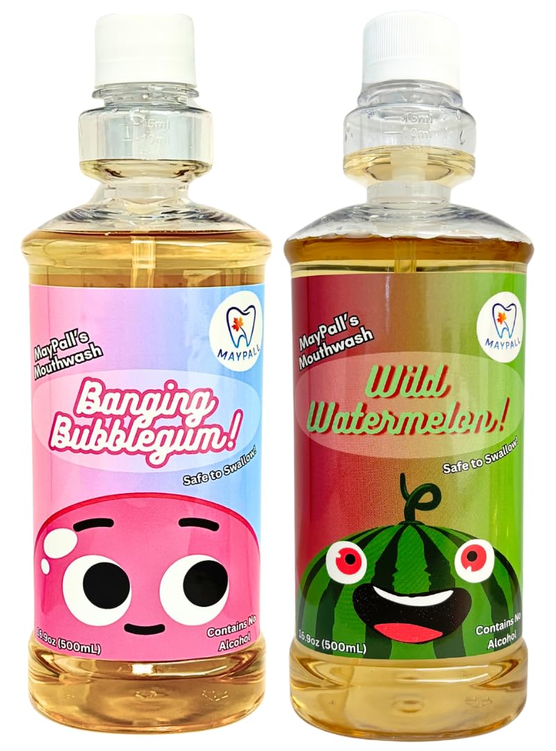Bubble Gum and Watermelon Flavored Kid's Mouthwash Safe to Swallow Natural Promotes Healthy Teeth Gentle Taste No Burn Fluoride Free Alcohol Free 16.9oz (Pack of 2). Bubblegum + Watermelon