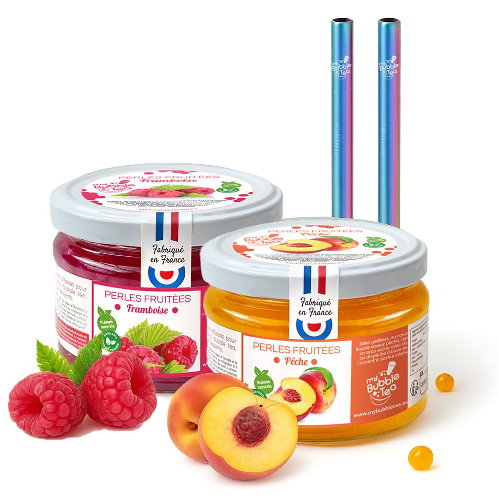 Craving easy-to-make, delicious, and eco-friendly homemade Bubble Tea? Discover our Peach Raspberry fruit pearl duo, made in France, complete with 2 reusable rainbow straws. Each 240g jar makes 6 generous Bubble Teas, for a total of 12 drinks. Simply add the pearls to flavored iced tea, fresh fruit juice, or a homemade cocktail for a fruity and surprising treat. Their liquid center bursts in your mouth for an explosion of flavors: the sweetness of mango and the tropical intensity of passion fruit. ? No artificial colors or flavors ? Vegan gelatin-free ? Made in Brittany with French syrups. This fruit pearl duo is ideal for trendy drink enthusiasts, creative desserts, or gourmet gifts. Use the pearls in: homemade Bubble Tea verrines, ice cream, or mousses tropical cocktails and mocktails. The 12mm stainless steel straws are perfect for sipping the pearls. They are washable and infinitely reusable. A My Bubble Tea creation, a French brand committed to a cleaner, more local, and more fun Bubble Tea. The fruity pearls can be stored at room temperature and away from light. Refrigerate after opening and consume quickly. Please note, the stainless steel straws are not dishwasher safe. Ingredients Peach: Water, Peach syrup 19 (sugar, water, peach juice from concentrate, natural peach flavoring, concentrated lemon juice, color: E160a), fructose, starch, natural flavoring, gelling agents: calcium lactate, calcium chloride, sodium alginate acidity regulator: citric acid thickener: xanthan gum Coloring: beta-carotene preservative: potassium sorbate. Fruit juice in syrup: 15 , including 10 peach juice. RASPBERRY: Water, raspberry syrup 22 (sugar, water, raspberry juice from concentrate, natural raspberry flavoring, concentrated lemon juice, coloring: E163), fructose, starch, natural flavoring, gelling agents: calcium lactate, calcium chloride, sodium alginate acidity regulator: citric acid thickener: xanthan gum coloring: anthocyanins preservative: potassium sorbate. Fruit juice in syrup: 15 , including 10 raspberry juice. Instructions: Add the pearls to flavored iced tea, fresh fruit juice, or a homemade cocktail. See more