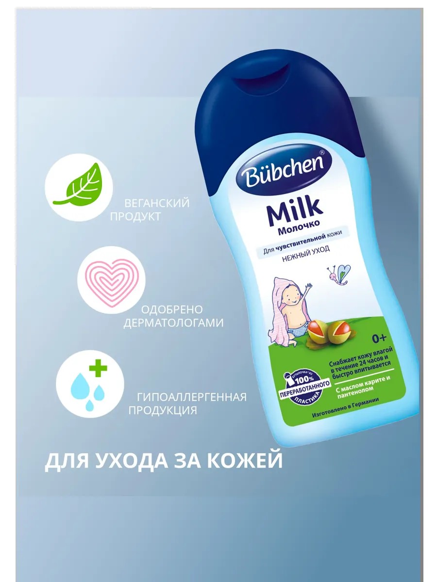 Легкая формула с маслом карите и пантенолом снабжает нежную детскую кожу влагой в течение 24 часов. Молочко быстро впитывается, успокаивает кожу и делает ее мягкой и эластичной. Акушеры и врачи рекомендуют Бюбхен.