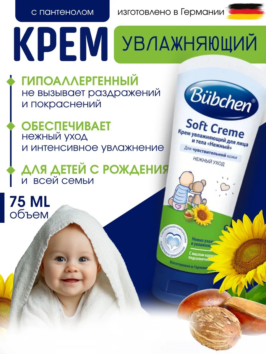 Увлажняющий крем для чувствительной кожи лица и тела новорожденных Bubchen Нежный имеет легкую консистенцию крема "масло в воде", которая позволяет ему мгновенно впитываться кожей и оставлять приятное ощущение. Чистые растительные масла и увлажняющие ингредиенты крема для лица и тела ухаживают за нежной кожей и защищают ее от пересыхания. Масло подсолнечника поддерживает естественный защитный барьер кожи, а масло карите делает ее нежной и эластичной. Пантенол, гелиотропин и витамин Е - увлажняют и препятствуют возникновению раздражения. Без добавления минерального масла, консервантов и красителей. Крем для младенцев предназначен для увлажнения нормальной и сухой кожи. Для детей с рождения и для всей семьи. Способ применения: Легкими массирующими движениями нанести небольшое количество крема тонким слоем на сухие участки кожи. Дать крему впитаться.