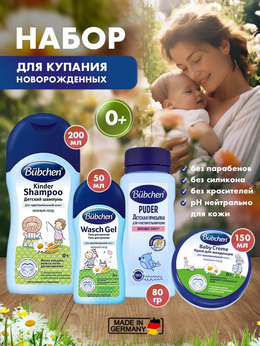| Full product name | Bubchen newborn cosmetic set: shampoo (200 ml), gel (50 ml), cream (150 ml), powder (80 gr.) |