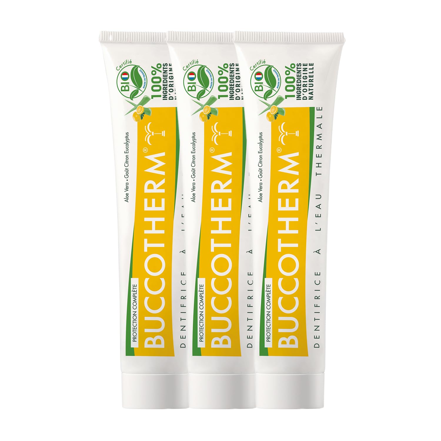 With the 3 x 75ml pack of BUCCOTHERM Complete Protection Toothpaste, give your mouth a feeling of purity and freshness. Certified organic, this toothpaste combines the benefits of Castéra-Verduzan thermal water, renowned for its soothing properties, with carefully selected natural active ingredients. Enriched with purifying organic lemon and refreshing eucalyptus, it effectively protects teeth and gums while providing long-lasting fresh breath. Its gentle, sulfate-free formula respects the balance of the oral flora, for uncompromising daily use. With 99 naturally derived ingredients, this toothpaste combines effectiveness, a pleasant sensory experience, and an ecological commitment. Developed and manufactured in France, it is Cosmébio certified and One Voice labeled for clean, healthy, and responsible oral hygiene. INGREDIENTS Aqua (Castéra-Verduzan thermal spring water), Hydrogenated starch hydrolysate, Hydrated silica, Glycerin, Aqua, Xylitol, Xanthan gum, Decyl glucoside, Aroma, Sodium fluoride, Stevia rebaudiana extract, Aloe barbadensis leaf juice powder, Limonene, Citral. DIRECTIONS FOR USE Use daily, at least twice a day, brushing teeth for two to three minutes. Do not swallow. Suitable for adults and children 7 years and older. SAFETY WARNING Contains sodium fluoride (1450 ppm fluoride). Do not use in children under 7 years of age. See moreECO-DESIGNED RANGE - Buccotherm is committed to more responsible oral hygiene. With our new eco-designed range, we are reinforcing our commitment by offering you products that are even kinder to your teeth and the planet. ? RECYCLED AND RECYCLABLE - Its tube is made from recycled plastic and is 100 recyclable. Its lightweight plastic cap features a tamper-evident system. Like all BUCCOTHERM products, our eco-designed range is manufactured at the source, at our production site in the heart of the Gers region, in southwestern France. DIRECTIONS FOR USE - Brush daily for 2 minutes, at least twice a day. This toothpaste is suitable for: adults seeking complete daily whitening care that is gentle on teeth, people prone to superficial stains on their teeth, and after having their teeth cleaned or whitened. Recommended by dentists. ? TRIPLE ACTION - Soothes gums and remineralizes enamel - Helps reduce occasional bleeding and gum sensitivity. Helps naturally strengthen enamel and restore teeth's natural whiteness - Helps fight plaque, promotes cavity prevention, and provides fresh breath with every brushing. COMPLETE PROTECTION LEMON EUCALYPTUS FLAVOR - The BUCCOTHERM Whitening Care Protection 3-pack is a certified organic toothpaste made with 100 naturally derived ingredients. Its formula combines Castéra-Verduzan thermal water with aloe vera, known for its soothing properties, and lemon eucalyptus to provide a restorative result and a feeling of freshness.BUCCOTHERM [Dentifrice Protection Complète Goût Citron Eucalyptus] Certifié Bio Apaise les gencives Protège Reminéralisant 100 d'ingrédients d'origine naturelle Lot de 3x75mlDESCRIPTION DU PRODUIT DESCRIPTION DU PRODUIT Avec le lot de 3x75 ML Dentifrice BUCCOTHERM Protection Complète, offrez à votre bouche une sensation de pureté et de fraîcheur. Certifié Bio, ce soin associe les bienfaits de l'eau thermale de Castéra-Verduzan, reconnue pour ses propriétés apaisantes, à des actifs d'origine naturelle soigneusement sélectionnés. Enrichi en citron bio aux vertus purifiantes et en eucalyptus rafraîchissant, il protège efficacement les dents et les gencives tout en procurant une haleine fraîche et durable. Sa formule douce et sans sulfates respecte l'équilibre de la flore buccale, pour un usage quotidien sans compromis. Avec 99 d'ingrédients d'origine naturelle, ce dentifrice allie efficacité, sensorialité et engagement écologique. Élaboré et fabriqué en France, il est certifié Cosmébio et labellisé One Voice pour une hygiène bucco-dentaire propre, saine et engagée. INGRÉDIENTS Aqua (eau thermale de Castéra-Verduzan), Hydrogenated starch hydrolysate, Hydrated silica, Glycerin, Aqua, Xylitol, Xanthan gum, Decyl glucoside, Aroma, Sodium fluoride, Stevia rebaudiana extract, Aloe barbadensis leaf juice powder, Limonene, Citral. MODE D'EMPLOI Utiliser quotidiennement, au moins deux fois par jour, en brossant les dents pendant deux à trois minutes. Ne pas avaler. Convient aux adultes et enfants à partir de 7 ans. AVERTISSEMENT DE SÉCURITÉ Contient du fluorure de sodium (1450 ppm de fluor). Ne pas utiliser chez l'enfant de moins de 7 ans. Voir plusGAMME ECO-CONÇUE - Buccotherm s'engage pour une hygiène bucco dentaire plus responsable. Avec notre nouvelle gamme éco-concue nous renforçons notre démarche en vous proposant des produits encore plus respectueux de vos dents et de la planète. ? RECYCLÉ ET RECYCLABLE - Son tube est fabriqué à partir de plastique recyclé et est 100 recyclable. Sa capsule allégée en plastique est dotée d'un système d'inviolabilité. Comme tous les produits BUCCOTHERM, notre gamme éco-conçue est fabriquée à la source, sur notre site de production au cœur du Gers, dans le sud-ouest de la France. CONSEILS D'UTILISATION - En brossage quotidien pendant 2 minutes, au moins deux fois par jour. Ce dentifrice convient : aux adultes recherchant un soin blanchissant complet quotidien et respectueux des dents, aux personnes sujettes à des tâches superficielles sur les dents, après avoir fait un détartrage ou un blanchiment dentaire. Recommandé par les dentistes. ? TRIPLE ACTION - Apaise les gencives et reminéralise l'émail - Favorise la diminution des saignements occasionnels et des sensibilités gingivales. Aide à renforcer naturellemeent l'émail et à redonner aux dents leur blancheur naturelle - Aide à lutter contre la plaque dentaire, Favorise la prévention des caries et procure une haleine fraiche à chaque brossage. PROTECTION COMPLETE GOÜT CITRON EUCALYPTUS - Le Lot de 3 BUCCOTHERM Protection Blancheur Soin est un dent