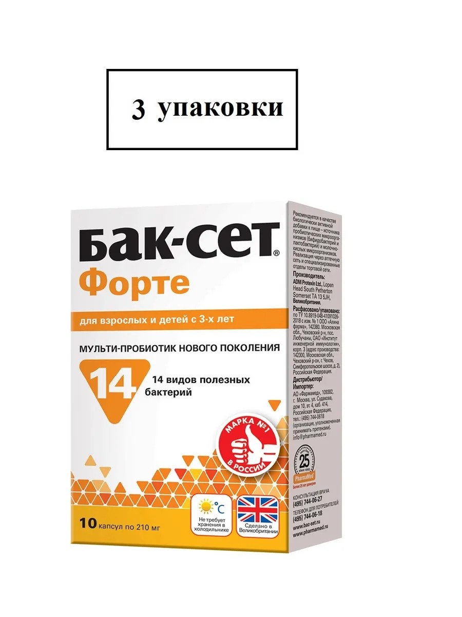 Бак-Сет Форте - мульти пробиотик, содержащий в составе 14 видов живых пробиотических бактерий, которые усиливают и дополняют действие друг друга, помогая справиться с нарушениями пищеварения у детей старше 3-х лет и взрослых.