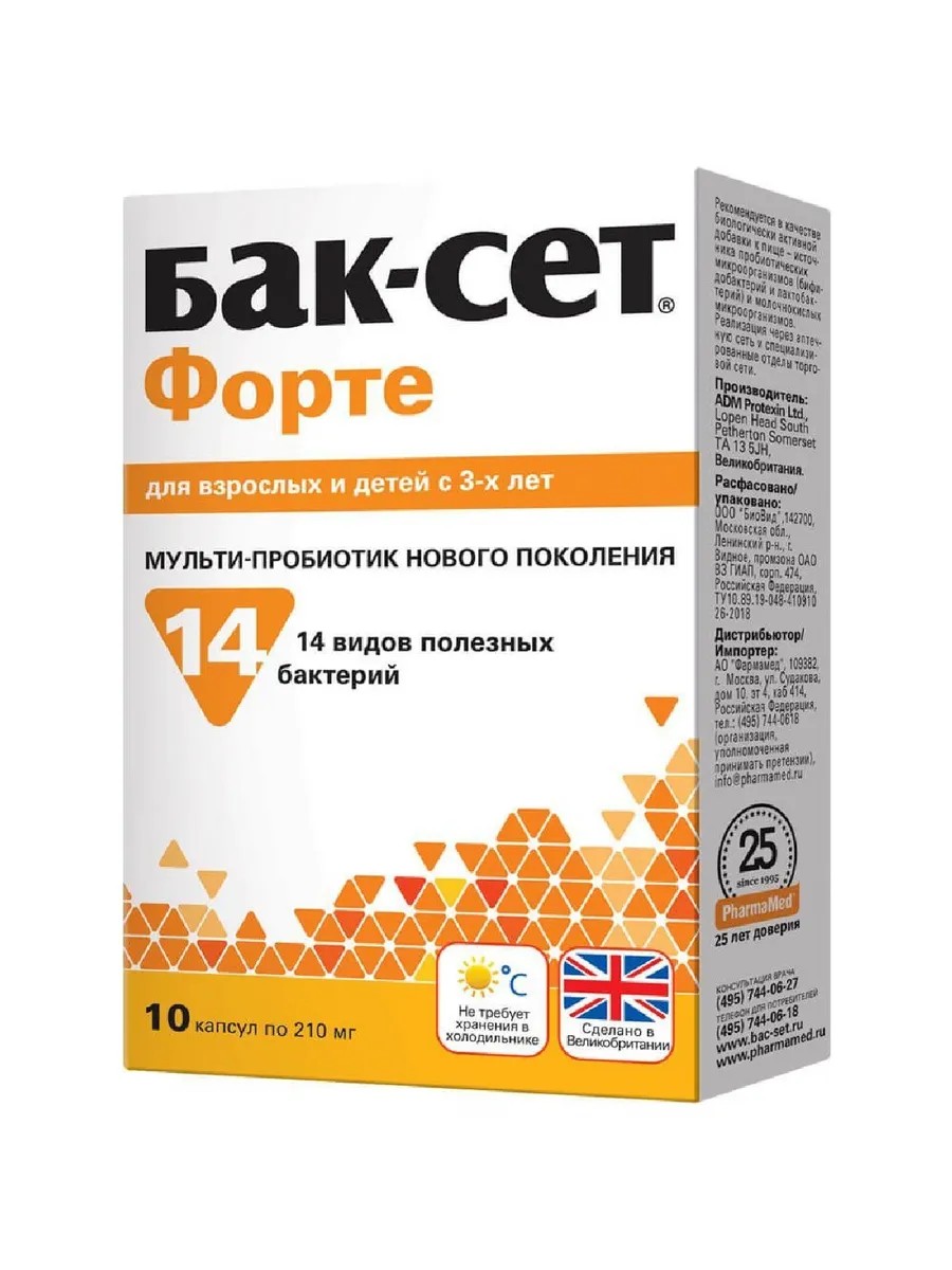 Бак Сет Форте, капсулы 10 - английский мультипробиотик нового поколения.Пробиотики для кишечника.Устраняет дисбактериоз. Пробиотик после антибиотиков, восстановление микрофлоры.Комплекс из 14 видов живых пробиотических бактерий помогает восстановить микрофлору кишечника и нормализовать пищеварение при дисбактериозе, запорах, приеме антибиотиков, кишечных инфекциях, аллергических состояниях.Пробиотические бактерии в Бак-Сет форте содержатся в высоких концентрациях, что позволяет им достигать толстого кишечника без потери активности и жизнеспособности.