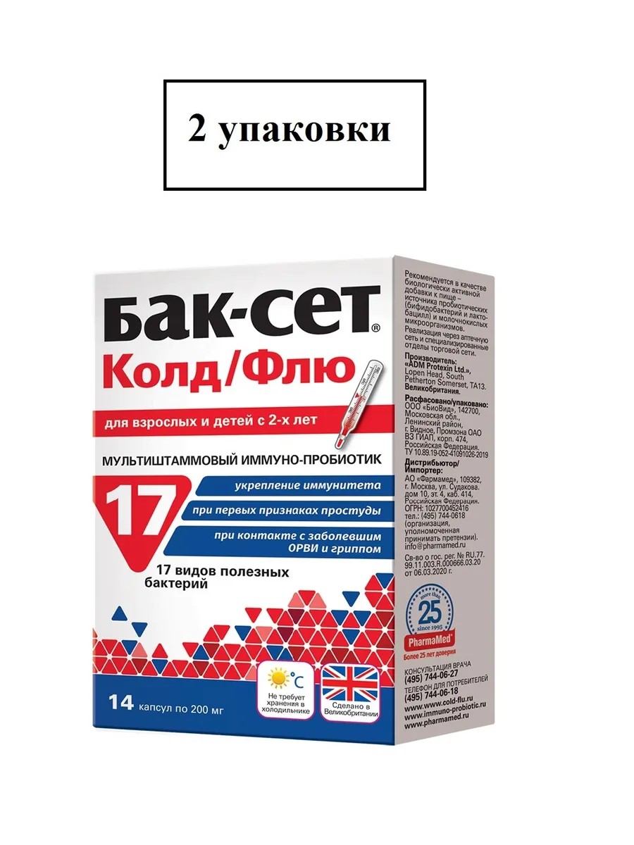 Бак-сет колд/флю - это биологически активная добавка (БАД) к пище, которая помогает справиться с симптомами простуды и гриппа. В составе препарата содержатся капсулы массой 200 мг, всего 14 штук в упаковке. Средство - это мультиштаммовый иммуно-пробиотик - ЕСТЕСТВЕННЫЙ АКТИВАТОР ИММУНИТЕТА