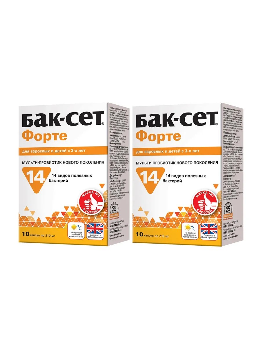 Бак-сет Форте по 10 капсул Бак-Сет Форте - мультипробиотик нового поколения для взрослых и детей с 3 лет.В состав комплекса входят 14 видов живых пробиотических бактерий, которые усиливают и дополняют действие друг друга. Бак-Сет Форте помогает восстановить микрофлору кишечника и нормализовать пищеварение при дисбактериозе, запорах, приеме антибиотиков, кишечных инфекциях, аллергических состояниях у детей старше 3 лет и взрослых.Благодаря усовершенствованной микрокапсулированной технологии производства полезные бактерии, входящие в состав комплекса, сохраняют свою жизнеспособность и активность в течение всего срока годности и при этом не требуют хранения в холодильнике.Бак-Сет Форте – единственный 14-штаммовый пробиотик с клинически доказанной эффективностью. Безопасность продукта Бак-Сет Форте подтверждена клиническими исследованиями.Может применяться при лактазной недостаточности.Область применения продукта Бак-Сет ФортеВ качестве биологически активной добавки - источника лактобактерий, бифидобактерий и молочнокислых микроорганизмов при:дисбактериозе;приеме антибиотиков;кишечных инфекциях и отравлениях;нарушении стула (диарея, запор);нарушениях пищеварения (боли, спазмы, вздутие живота);пищевой аллергии, дерматитах;смене рациона и режима питания (посещение детских организованных коллективов, путешествия).