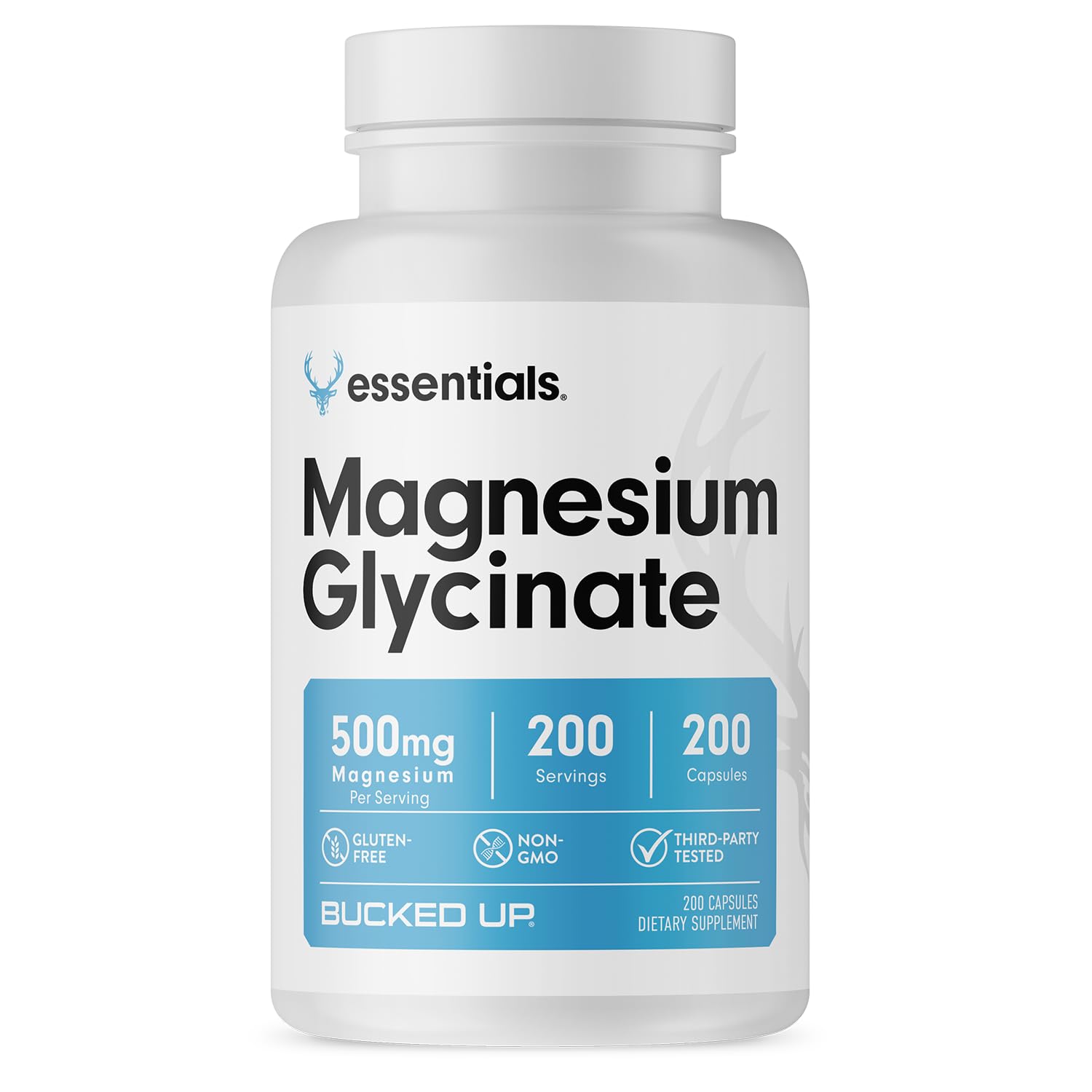 CONVENIENT DAILY SERVINGS With 200 capsules per bottle and one capsule per serving this magnesium supplement provides a long lasting 200 day supply designed for simplicity and routine use. NON GMO AND GLUTEN FREE Created without genetically modified ingredients or gluten offering a clean formula suitable for diverse dietary preferences and lifestyles focused on ingredient transparency. BUCKED UP ESSENTIALS QUALITY Manufactured in GMP compliant facilities and tested by third party laboratories to verify potency and purity so every bottle meets Bucked Up's trusted standards for consistency. CLEAN INGREDIENT PROFILE Contains only essential ingredients including HPMC vegetable capsule microcrystalline cellulose organic rice extract blend stearic acid and vegetable magnesium stearate ensuring purity and quality. CHELATED MAGNESIUM GLYCINATE Each capsule delivers 500mg of magnesium bisglycinate chelate providing a high quality and easily absorbable form of magnesium for consistent daily use and nutritional support.