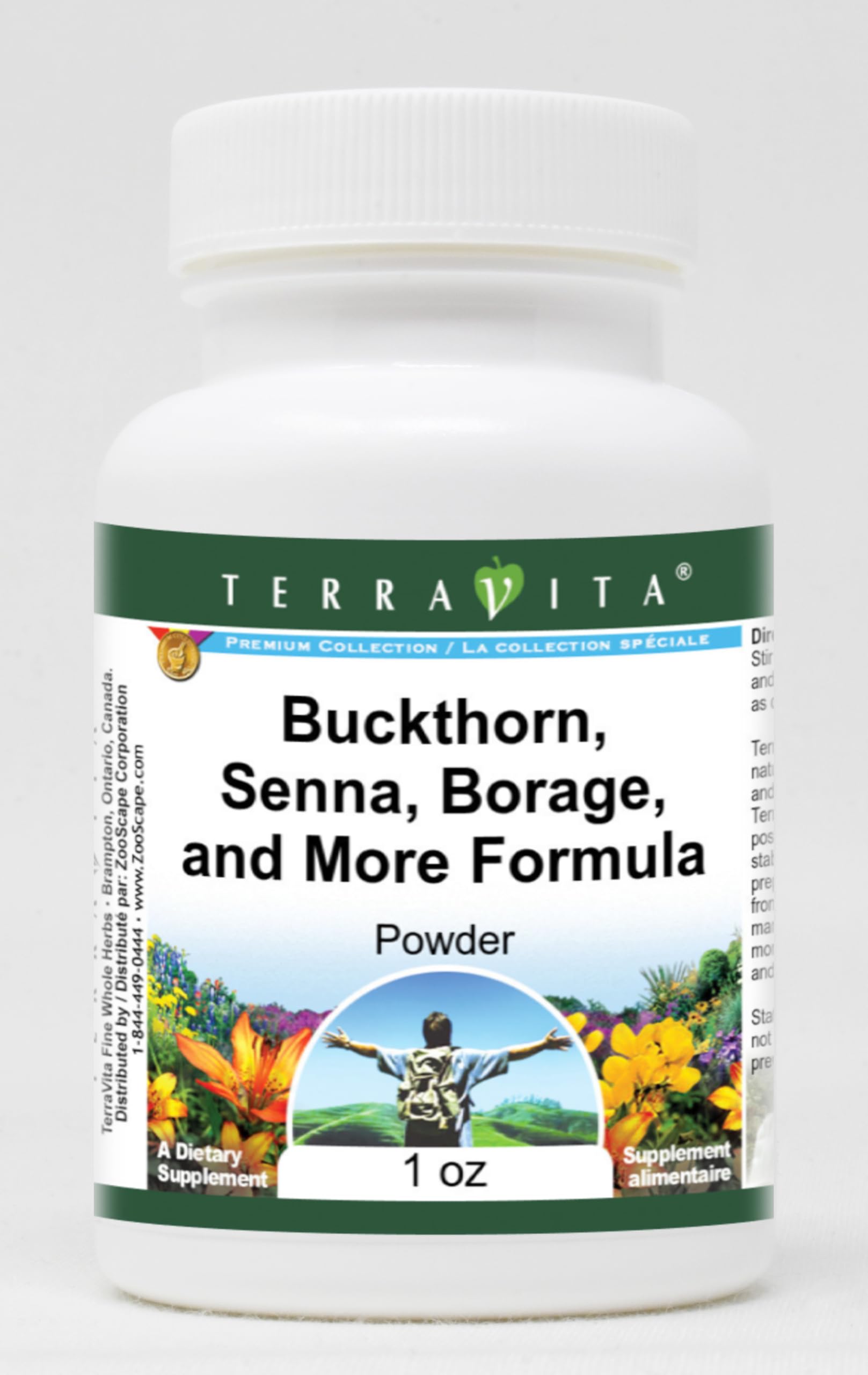 Convenient Powder format. Size: 1 oz. Manufacturer: TerraVita. No fillers. Buckthorn, Senna, Borage, and More Formula Powder (1 oz, ZIN: 512207).