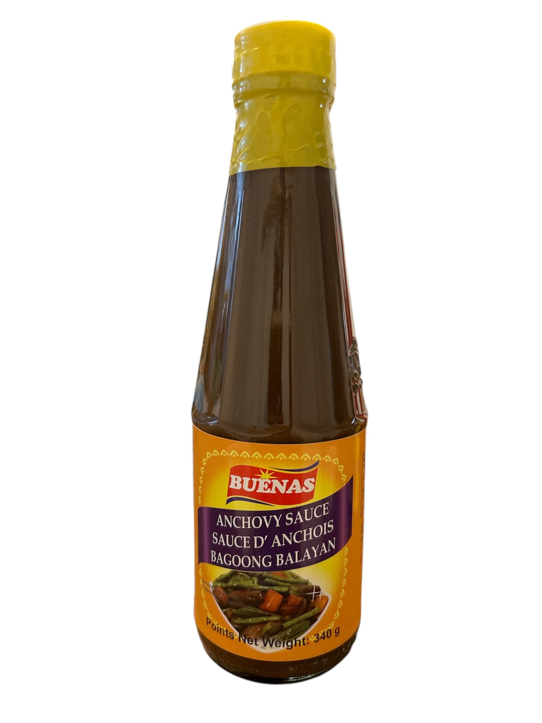 Buenas Anchovy Sauce is a flavourful condiment that adds an umami punch to your favourite dishes. This versatile sauce is made with anchovies and other savoury ingredients, resulting in a rich, salty taste that enhances the flavours of meats, vegetables, and more. With a net weight of 340 g, this bottle provides ample servings to elevate your culinary creations. Whether you're preparing a classic Caesar salad, marinating proteins, or creating a flavourful pasta sauce, Buenas Anchovy Sauce is an essential ingredient for adding depth and complexity to your recipes. Enjoy the convenience of this bottled sauce and explore new dimensions of flavour in your home-cooked meals.Quality Ingredients: Made with carefully selected anchovies and spices to deliver an intense, savoury flavour profile. Pantry Essential: A must-have ingredient for creating authentic Filipino and Southeast Asian cuisine at home. Convenient Packaging: Comes in a 340g glass bottle with a screw cap for easy storage and dispensing. Versatile Condiment: Enhance the taste of your dishes by adding a few dashes of this flavourful sauce to soups, marinades, dips, and more. Authentic Anchovy Sauce: Savour the rich, umami flavour of this traditional Filipino bagoong balayan anchovy sauce.