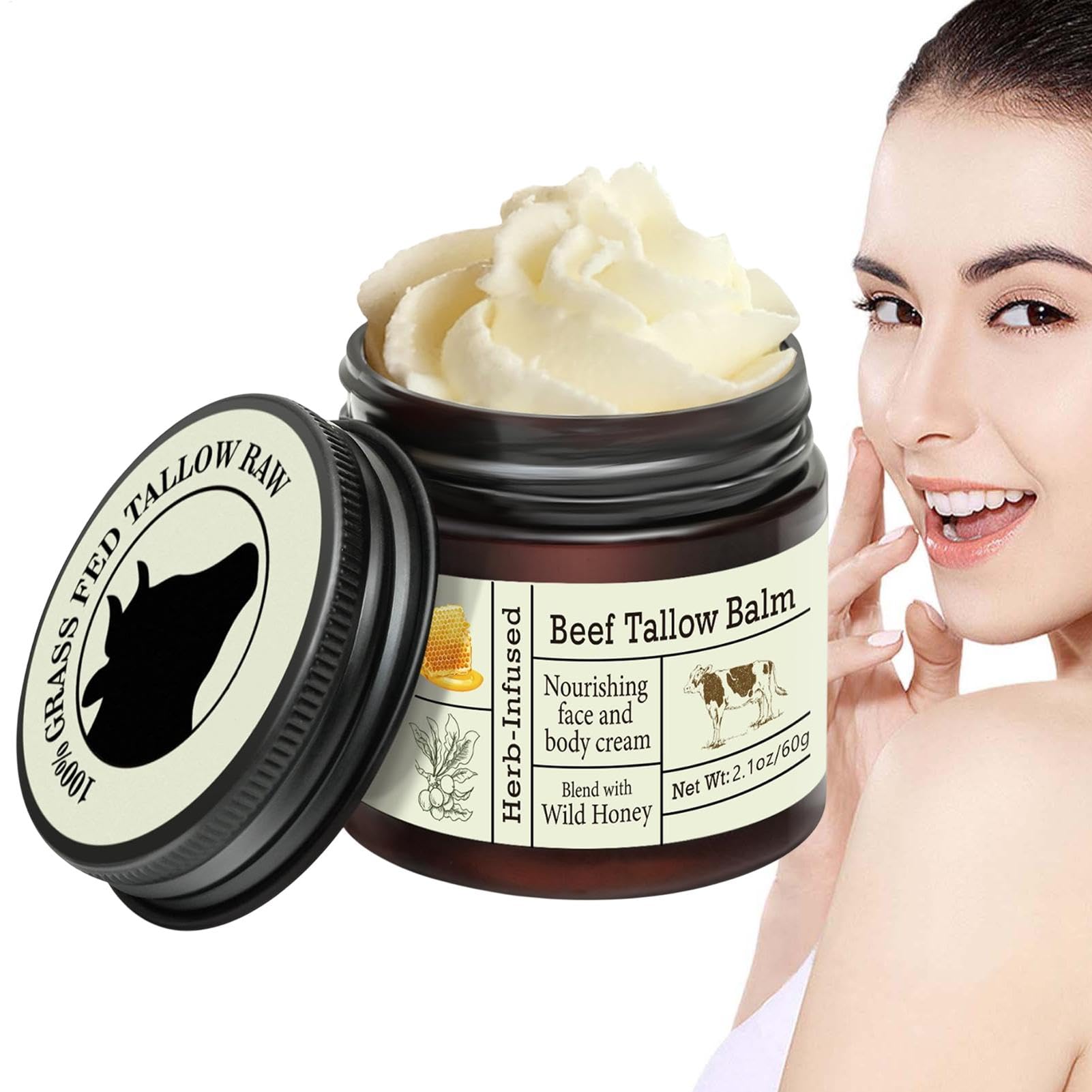 Lightweight and non-greasy texture in a convenient 50g jar Unlike thick creams, this balm melts effortlessly into the skin, absorbing quickly without leaving a sticky or greasy residue, making it perfect for everyday use at home or on the go. Soothing relief for dry, sensitive, and irritated skin Packed with fatty acids, this balm helps to calm, reduce redness, and promote skin regeneration, making it ideal for those with chapped or cracked skin. Multi-purpose face and body moisturizer for all skin types Designed to hydrate, repair, and protect, this versatile balm can be used on the face, hands, elbows, knees, and other dry areas, making it a great addition to any routine. Organic formula with natural ingredients Free from artificial additives and harsh chemicals, this gentle balm blends nutrient-rich tallow with antioxidant-rich honey, providing a soothing and protective barrier to support overall skin health. Nourishing beef flesh balm for deep hydration Made with tallow and honey, this rich and emollient balm provides intense moisture, helping to restore the skin's natural softness and elasticity for a healthy, radiant glow.Baume De Miel De Bœuf, Crème De Suif Biologique De Boeuf, Crème Hydratante Pour Le Visage, Formule Apaisante, Texture Légère Non Grasse, 50 G, Pour Les Soins De La Peau Doux Et SouplesTexture légère et non grasse dans un pot 50g pratique Contrairement aux crèmes épaisses, ce baume fond sans effort dans la peau, absorbant rapidement sans quitter un collant ou gras, le rendant parfait pour une utilisation quotidienne à la maison ou. Soulagement apaisant pour la peau sèche, sensible et irritée Emballé avec des acides gras et, ce baume aide à calmer, à réduire les rougeurs et à favoriser la régénération de la peau, ce qui le rend idéal pour les personnes avec ou la peau gercée. Hydratant multi-usage pour le visage et le corps pour les types de peau Conçu pour hydrater, réparer et protéger, ce baume polyvalent peut être utilisé sur le visage, les mains, les coudes, les genoux et autres zones sèches, ce qui en fait un ajout à toute routine. Formule organique avec des ingrédients naturels Des additifs artificiels et des produits chimiques durs, ce baume doux mélange le suif riches en nutriments avec un miel riche en antioxydant, offrant une barrière apaisante et protectrice pour soutenir la santé globale de la peau. Baume de chair de bœuf nourrissant pour l'hydratation profonde Fabriqué avec du suif et du miel , ce balm riche et émollient offre une humidité intense, aidant à restaurer la douceur et l'élasticité naturelles de la peau pour une lueur saine et radieuse.