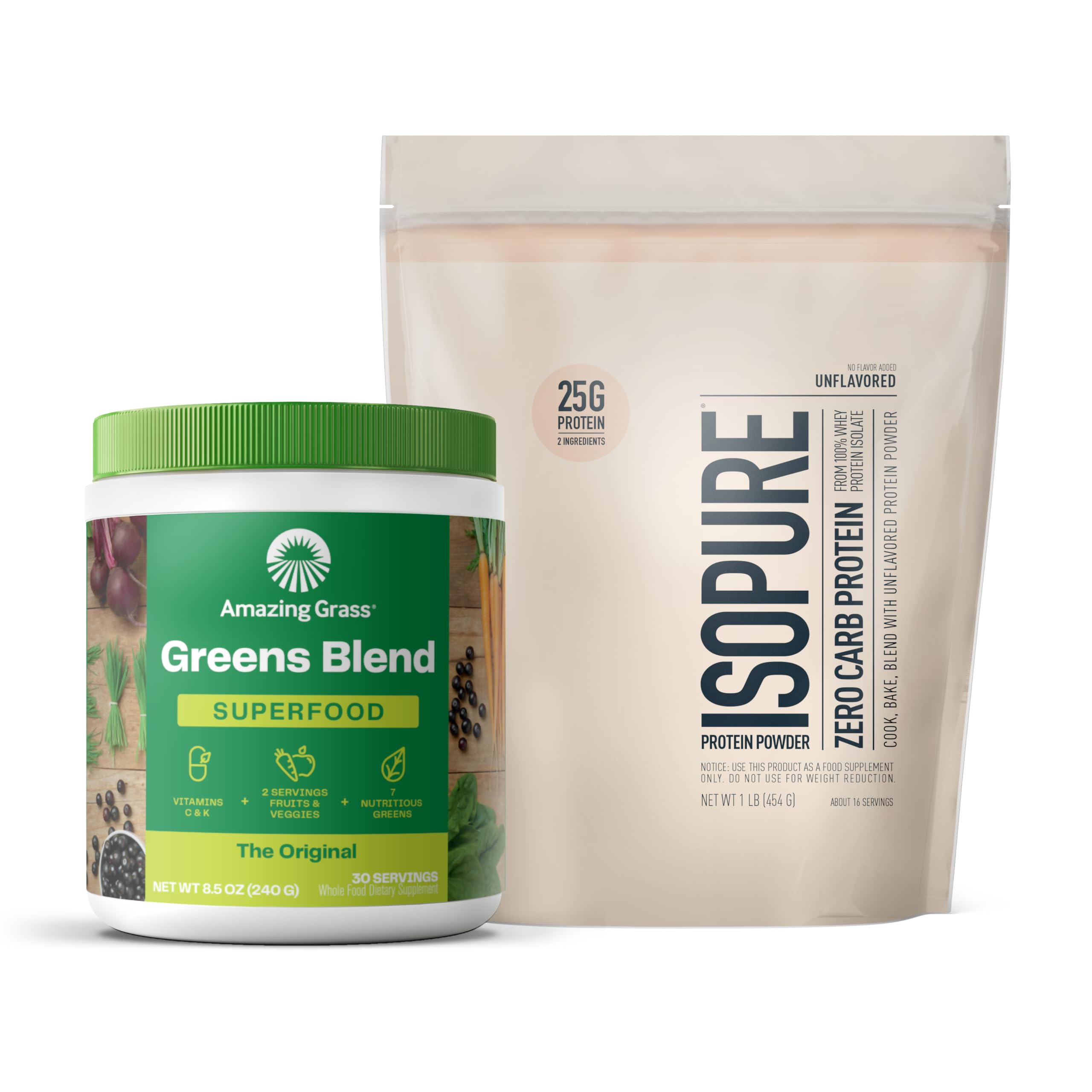 Simply add a scoop of Isopure Unflavored Whey Isolate with a scoop of Amazing Grass Green Superfood into your favorite smoothie recipe!. A perfect fit - Supports your active lifestyle and can be used post-workout, between meals, along with a healthy breakfast, or any time of day. Both Products are Gluten Free and Non-GMO to fit your lifestyle goals. Amazing Original Greens Superfood promotes healthy digestion, Isopure Zero Carb to help hit your daily protein as part of a healthy diet. 25g Whey Protein Isolate Per Scoop of Isopure Unflavored Whey Isolate and Superfood Greens Powder Boost with Amazing Grass Original Greens Blend.
