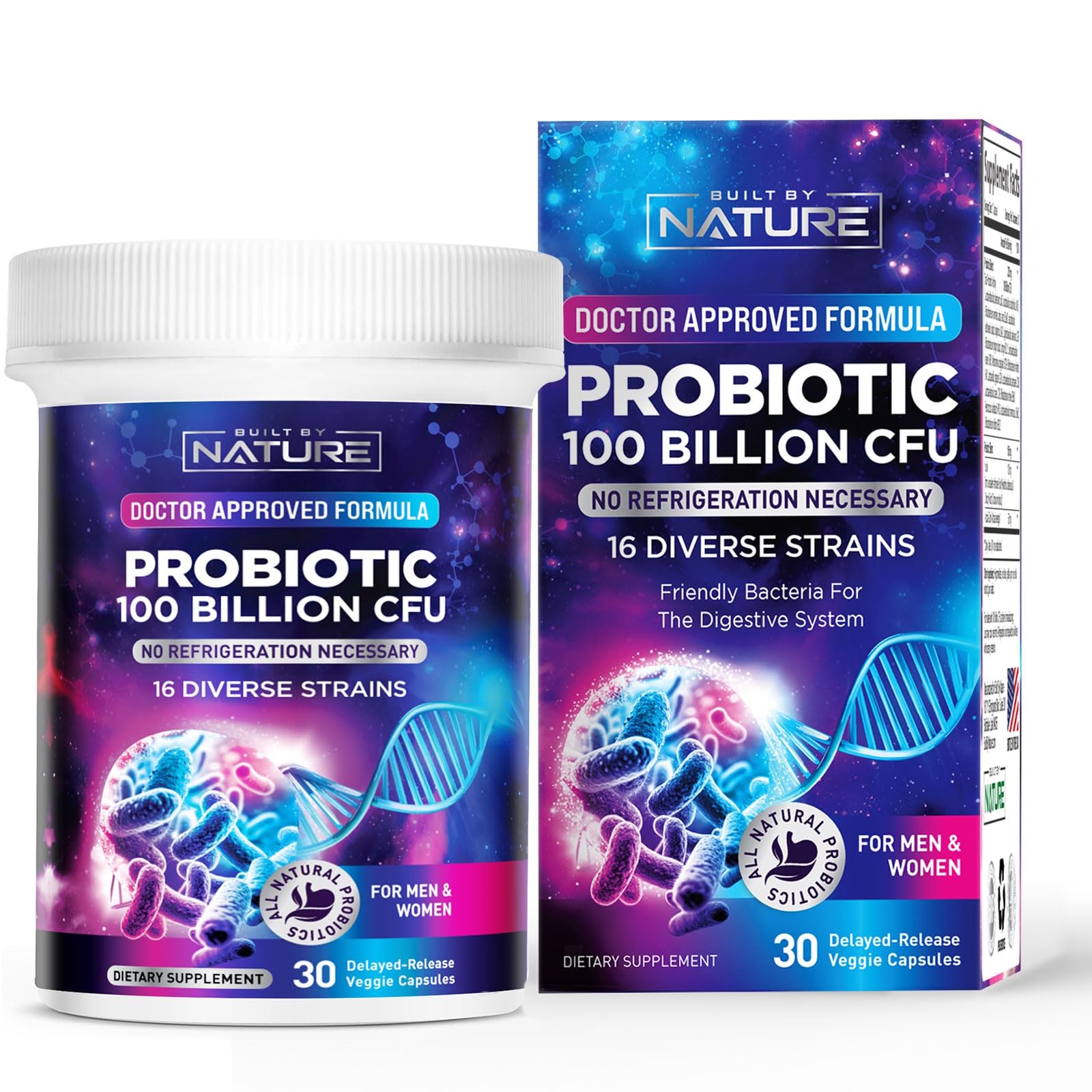 Built By Nature100 Billion CFU Probiotic features 100 Billion CFUs from 16 diverse probiotic strains plus prebiotics to help balance your digestive tract, strengthen immune support, and support overall wellness. Formulated in delayed release capsules and speical CSP desiccant bottle to maximize fresehness and effectiveness, this shelf-stable and non-GMO supplement is ideal for both women and men seeking an effective probiotic.