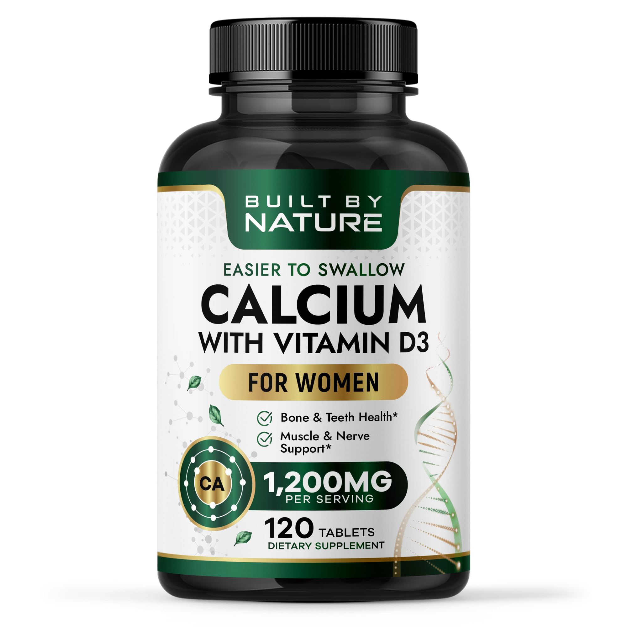 Support your body's foundation with Built By Nature Calcium with Vitamin D3. This high-potency supplement delivers 1200mg of calcium plus Vitamin D3 in every serving, ensuring maximum absorption and effectiveness. Calcium is essential for maintaining strong bones, healthy teeth, and proper muscle function, while Vitamin D3 enhances absorption and provides added immune support. Whether you're looking to protect bone density as you age, boost daily calcium intake, or simply strengthen your wellness routine, this supplement has you covered. Each bottle provides 120 tablets for a convenient, long-lasting supply. Our tablets are easy to swallow, non-GMO, gluten-free, and made in a cGMP facility for purity and quality you can trust. Built By Nature delivers the perfect balance of calcium and vitamin D, making it one of the best choices for anyone seeking a reliable calcium supplement with vitamin d3 – strong bones, healthy living, every day.Premium Quality Value – Non-GMO, gluten-free, and bottled in the USA, our calcium pills provide trusted nutrition at a great value – high-potency support you can count on. Easy-to-Swallow Tablets – Built By Nature Calcium tablets are carefully designed for convenience, offering a simple way to get the recommended calcium and vitamin d intake without large pills or chalky powders. Bone Immune Support Formula – Calcium with Vitamin D3 works together to promote bone density, joint comfort, and immune defense, making it a complete calcium vitamin d supplement for daily wellness. Calcium 1200mg with Vitamin D3 – Each serving provides 1200mg of calcium plus Vitamin D3 for superior absorption and effectiveness, delivering the essential nutrients your body needs for bone and immune health. Calcium Supplements for Women – Specially formulated to support strong bones, teeth, and muscles, this daily calcium supplement is ideal for women and men of all ages looking to maintain long-term bone strength.