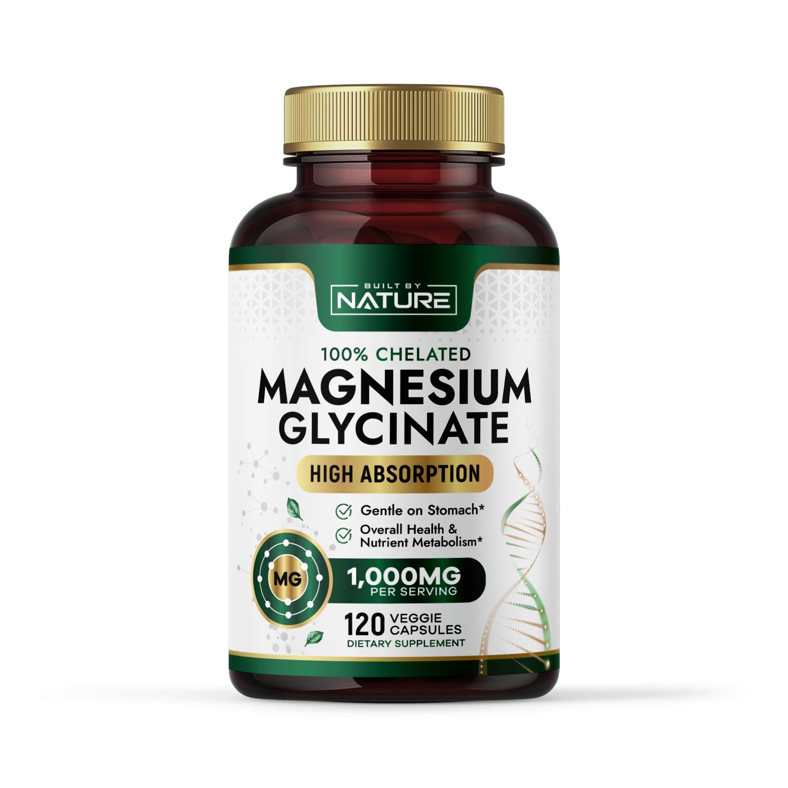 Built By Nature Magnesium Glycinate 1000mg High Absorption Magnesium Supplement 100% Chelated Gentle on Stomach - Muscle Heart Bone & Relaxation Support - Non-GMO Vegan - 120 Capsules 120 Count (Pack of 1)