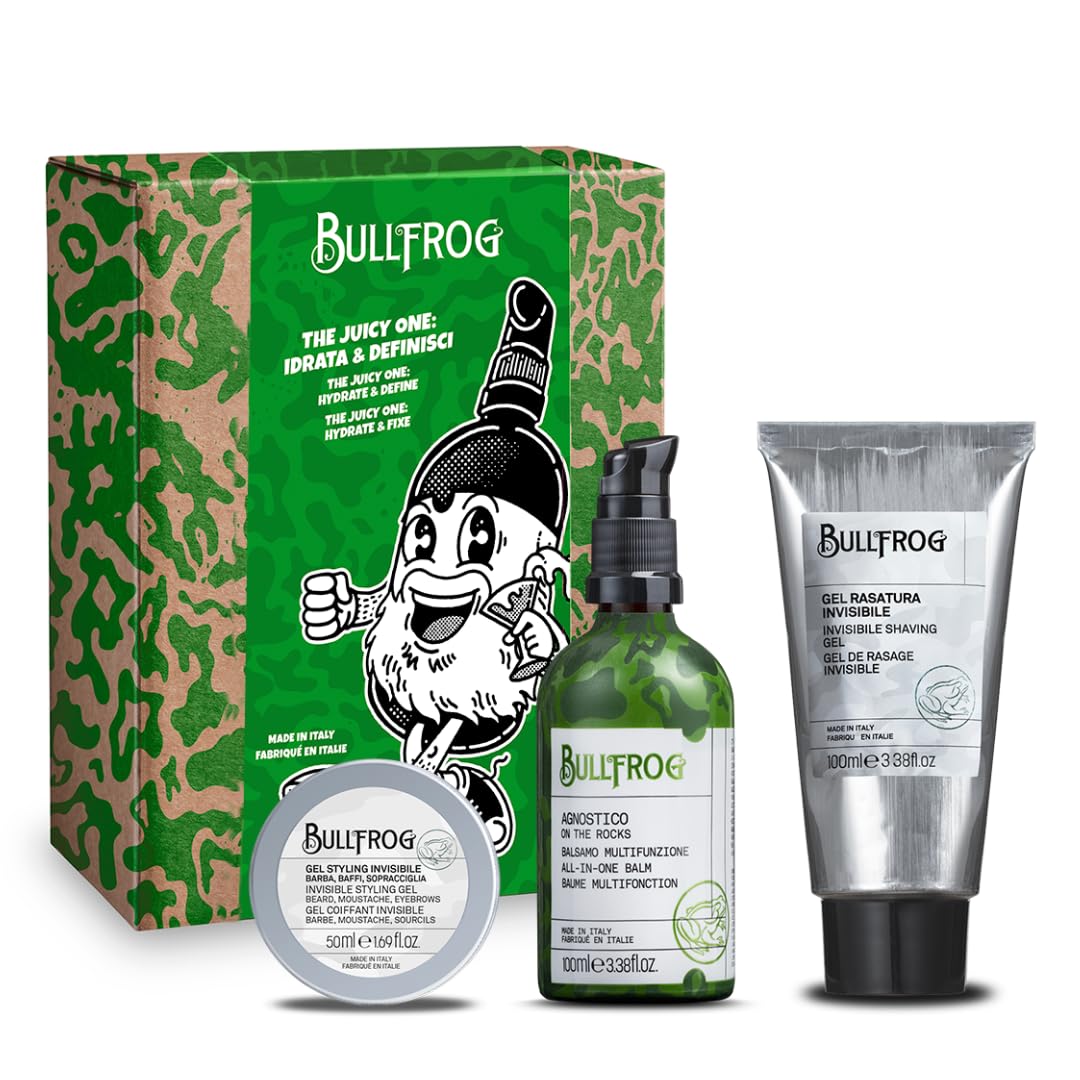 Unruly and difficult-to-manage beard? This routine, made up of a few simple steps, is the key to a healthy, hydrated, and well-defined beard. Perfect for gifting! SAFETY WARNING Avoid contact with eyesBullfrog: A plunge into 1930s America, the barber's smile, sitting in a leather chair, and not having to think about a thing. Bullfrog is the ultimate barbering and grooming experience that starts in-store and continues at home thanks to a collection of treatments and accessories designed to combine cosmetic effectiveness with respect for the environment. Benefits: What makes this kit unique? The balm with citrus, woody, and amber notes combines care and an exclusive fragrance, while the styling and shaving gel ensures order and practicality. Benefits: How to improve your routine? Intense hydration, a close shave, and residue-free styling. The juicy fragrance with citrus and woody notes brings freshness and character. Package contents: Grooming kit consisting of a 100ml multi-purpose balm, a 100ml transparent shaving gel, and a 50ml invisible styling gel. Ideal for a soft, hydrated, and perfectly defined beard. Bullfrog Kit The Juicy One: a complete beard and brow routine with multi-purpose balm, invisible shaving gel, and styling gel. Moisturizes, defines, and leaves an iconic citrus and amber fragrance.Bullfrog - Kit The Juicy One Hydrate et Définir 3 en 1, Limited Edition, Agnostique On The Rocks Baume Multifonction 100 ml, Gel Rasage Invisible 100 ml et Gel Styling Invisible 50 mlDESCRIPTION DU PRODUIT DESCRIPTION DU PRODUIT Barbe indisciplinée et difficile à gérer ? Cette routine composée de quelques gestes simples est la clé pour avoir une barbe saine et hydratée et en même temps définie et ordonnée. Idéal à offrir et à offrir ! AVERTISSEMENT DE SÉCURITÉ Évitez tout contact avec les yeuxBullfrog: Un plongeon dans l'Amérique des années 1930, le sourire du barbier, s'asseoir sur un fauteuil en cuir et ne pas avoir à penser à rien. Bullfrog est la meilleure expérience de barberie et de toilettage qui commence en mag et continue à la maison grâce à la collection de traitements et d'accessoires conçus pour associer efficacité cosmétique et respect de l'environnement. Avantages : Qu'est-ce qui rend ce kit unique ? Le baume aux notes d'agrumes, boisées et ambrées allie soin et parfum exclusif, tandis que le gel coiffage et rasage garantissent l'ordre et la praticité. Avantages : Comment améliorer votre routine ? Hydratation intense, rasage précis et coiffage sans résidus. La fragrance juteuse aux notes d'agrumes et de bois apporte fraîcheur et caractère. Contenu du colis : kit de toilettage composé d'un baume multifonction 100 ml, gel de rasage transparent 100 ml et gel coiffage invisible 50 ml. Idéal pour une barbe douce, hydratée et parfaitement définie. Bullfrog Kit The Juicy One : routine complète pour barbe et sourcils avec baume multifonction, gel rasage invisible et gel coiffant. Hydrate, définit et laisse une fragrance emblématique agrumée et ambrée.