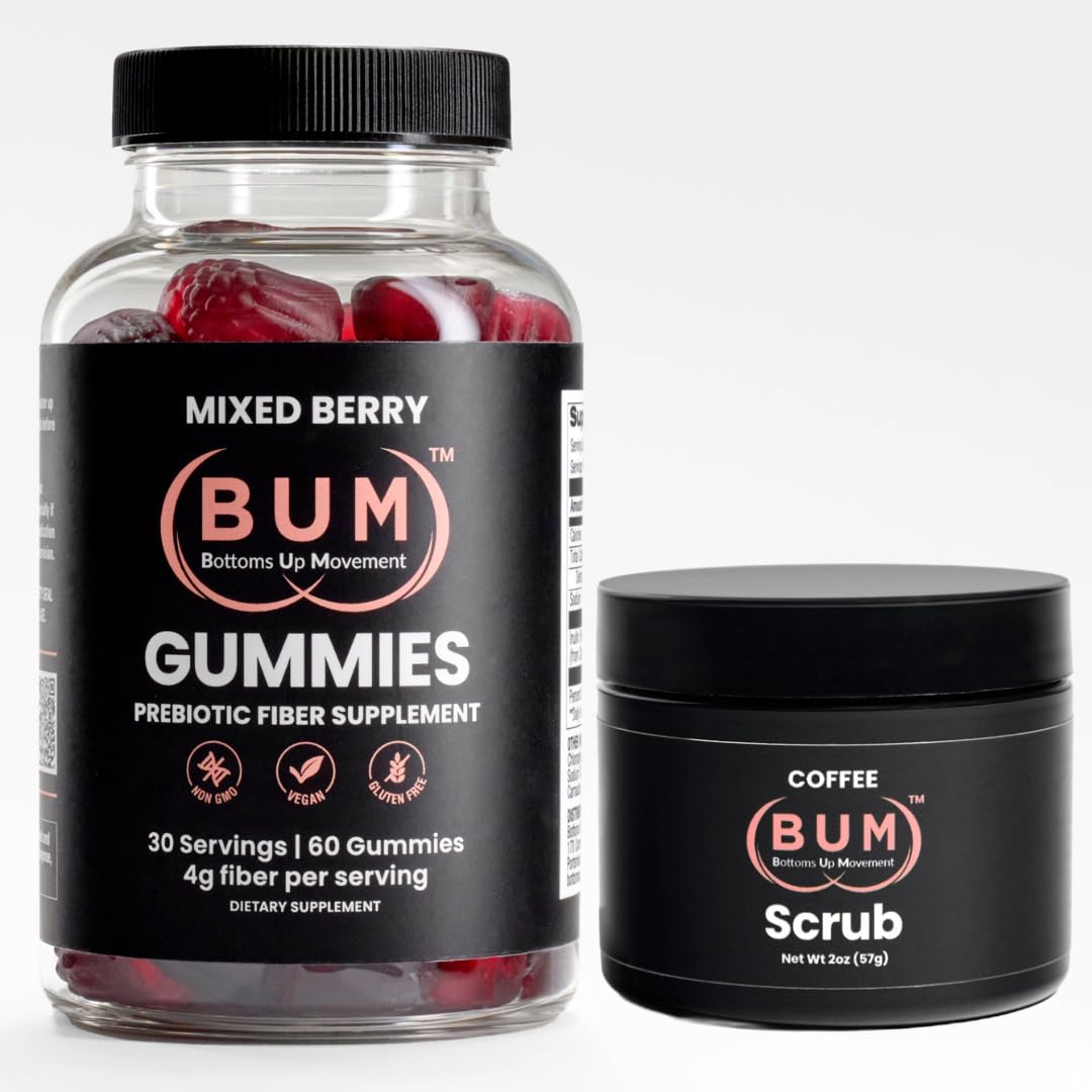 Bum Prebiotic Fiber Gummies and Exfoliating Coffee Scrub 2oz Bundle Gut Health Bloating Relief Fresh-Smelling Smooth Skin Bottom Confidence
